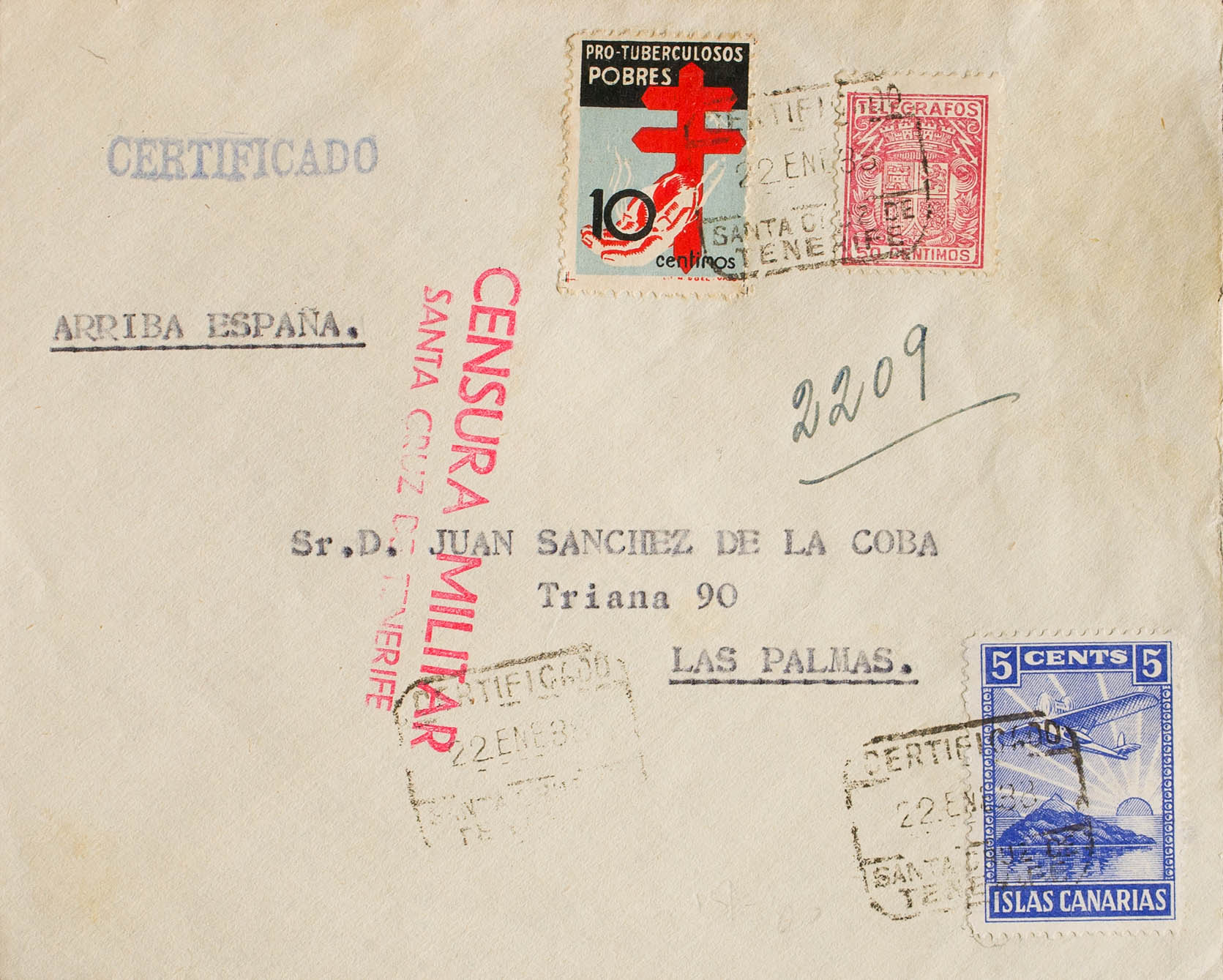 Teleg.72. 1938. 10 cts negro azul y rojo, 50 cts carmín de Telégrafos y Benéfico de 5 cts. Certificado de SANTA CRUZ DE TENERIFE a LAS PALMAS. Al dorso llegada. MAGNIFICA Y RARA COMBINACION DE FRANQUEO CON UN SELLO DE TELEGRAFOS.