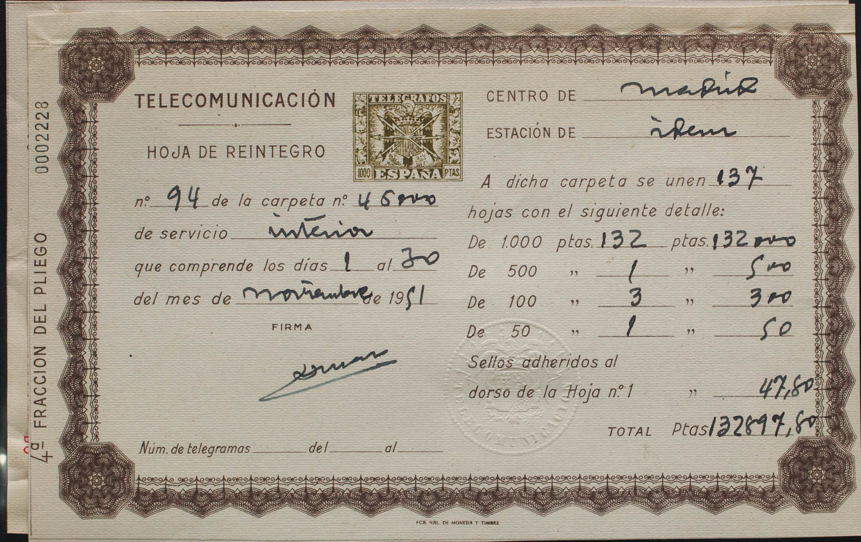 ET5, ET6. 1952. 500 pts naranja y 1000 pts verde oliva sobre Enteros Postales Telegráficos "Hojas de Reintegro", fechadas en Barcelona y Madrid, respectivamente. MAGNIFICAS Y RARAS.