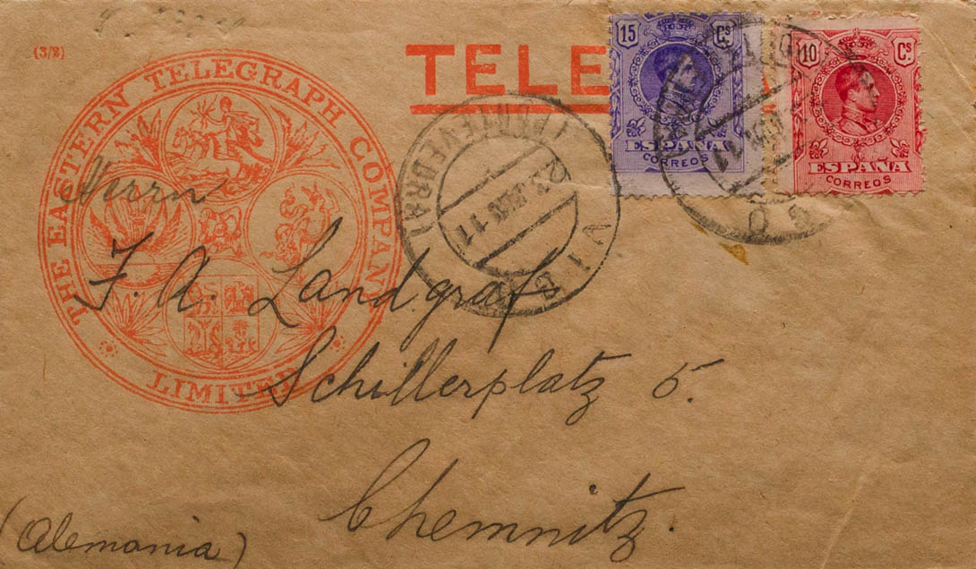 269, 270. 1911. 10 cts rojo y 15 cts violeta. Sobre Ilustrado de la CompañÃa EASTERN TELEGRAPH COMPANY de VIGO a CHEMNITZ (ALEMANIA). MAGNIFICA Y RARA.