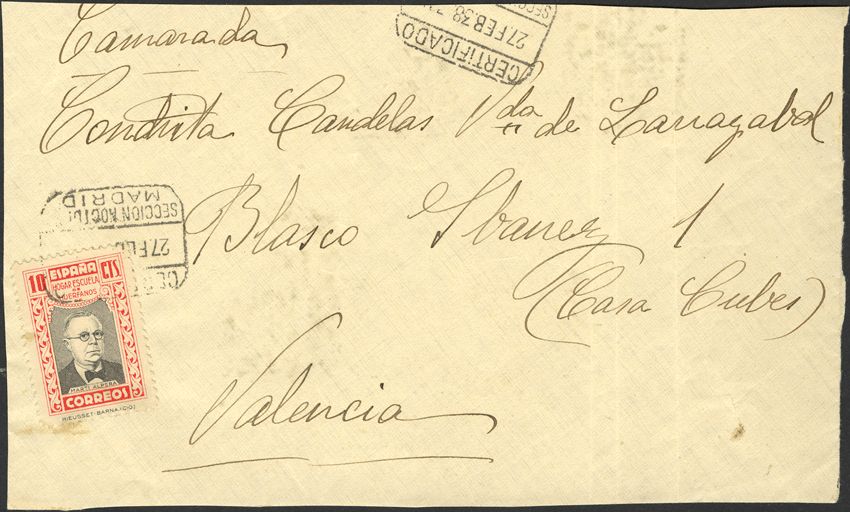 Benef. 13. 1938. 10 cts rosa y gris. Frontal de MADRID a VALENCIA. Matasello CERTIFICADO / SECCION NOCTURNA / MADRID. MAGNIFICA.
