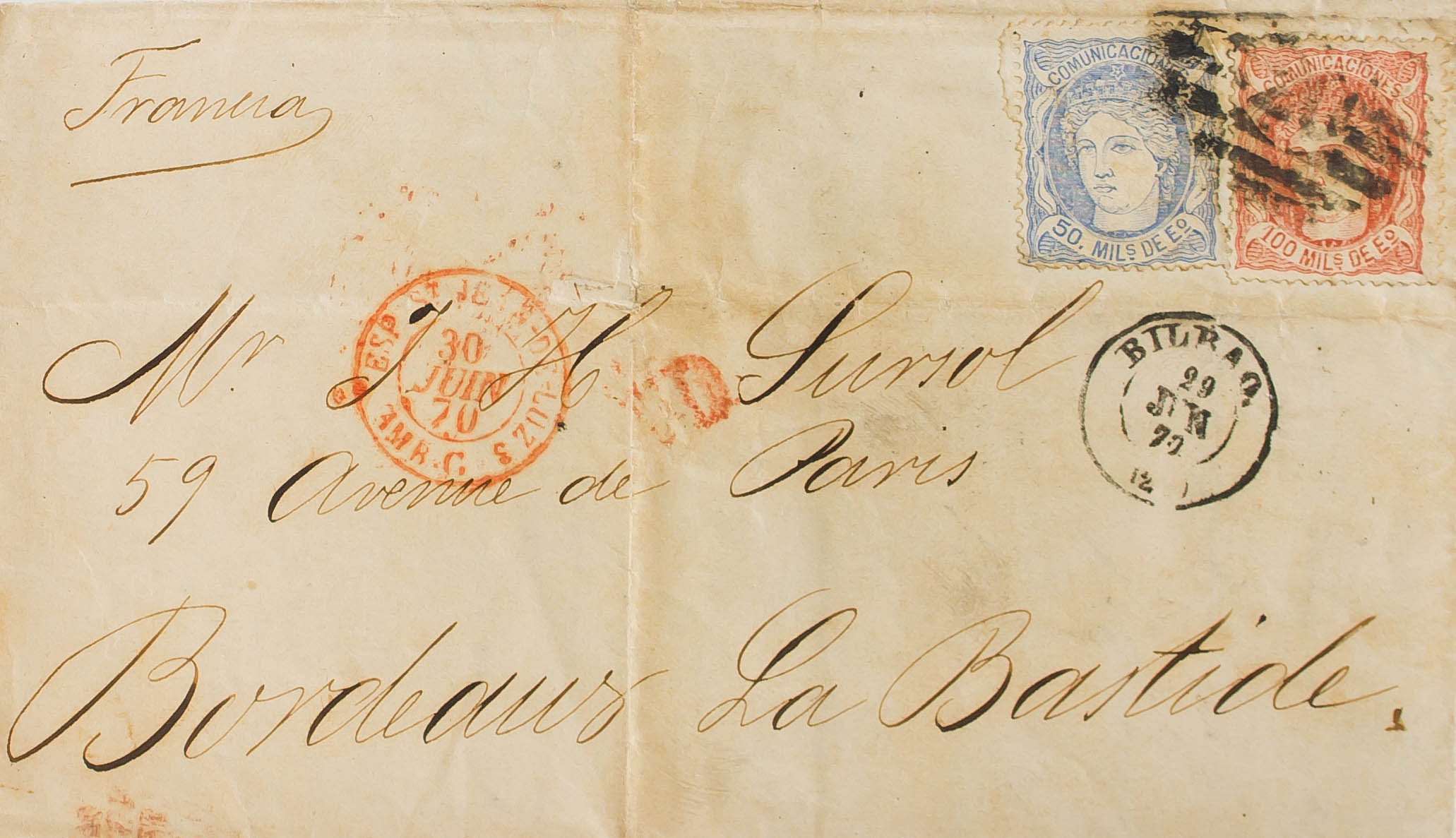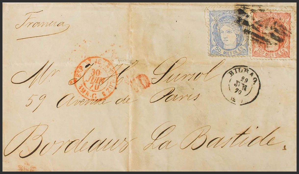 107, 108. 1872. 50 mils y 100 mils. BILBAO a BURDEOS (FRANCIA). MAGNIFICA Y RARA COMBINACION PARA COMPONER LOS 150 MILS.