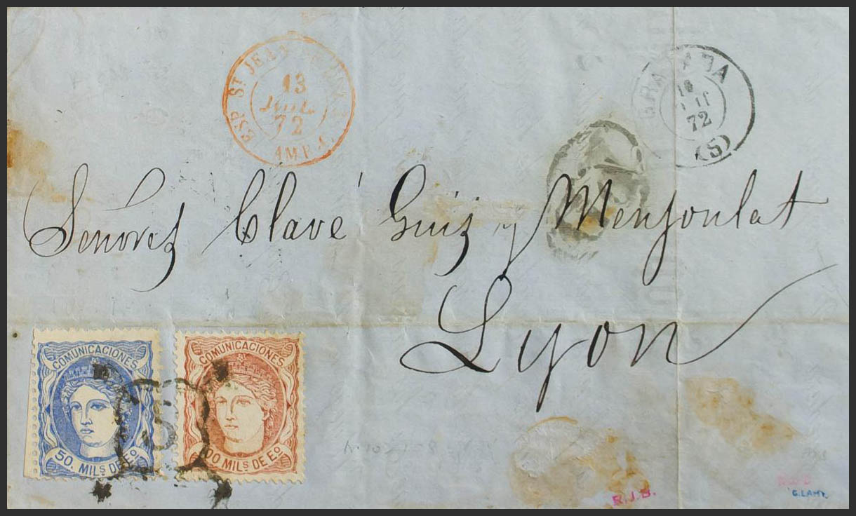 107, 108. 1872. 50 mils ultramar y 100 mils castaño rojo. GRANADA a LYON (FRANCIA). Matasello ARAÑA DE GRANADA Nº5. MAGNIFICA Y MUY RARA Y ESPECTACULAR.