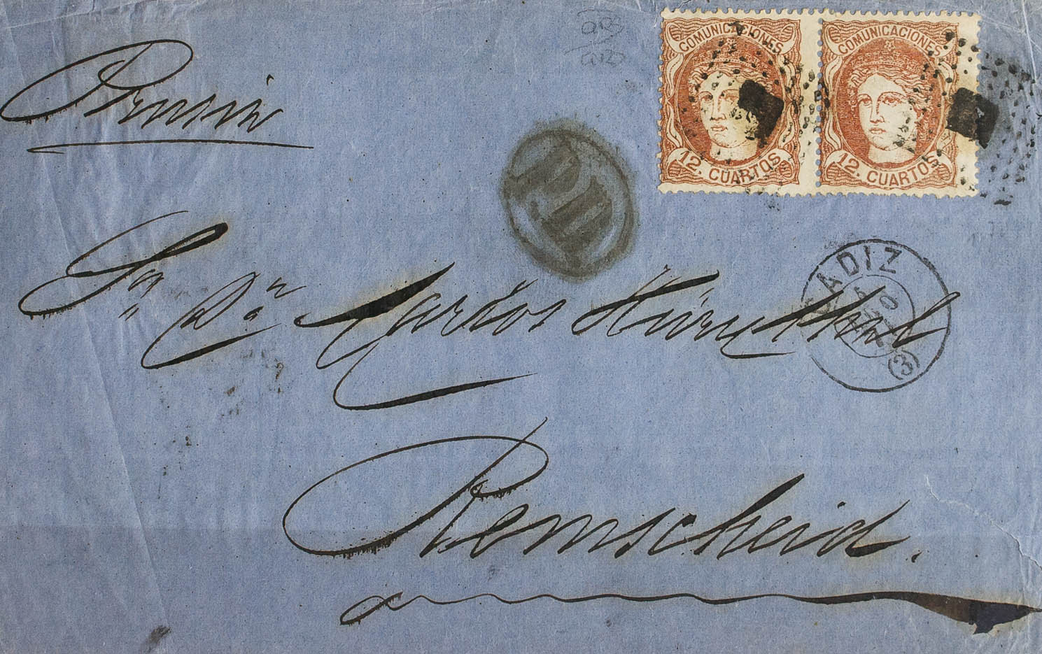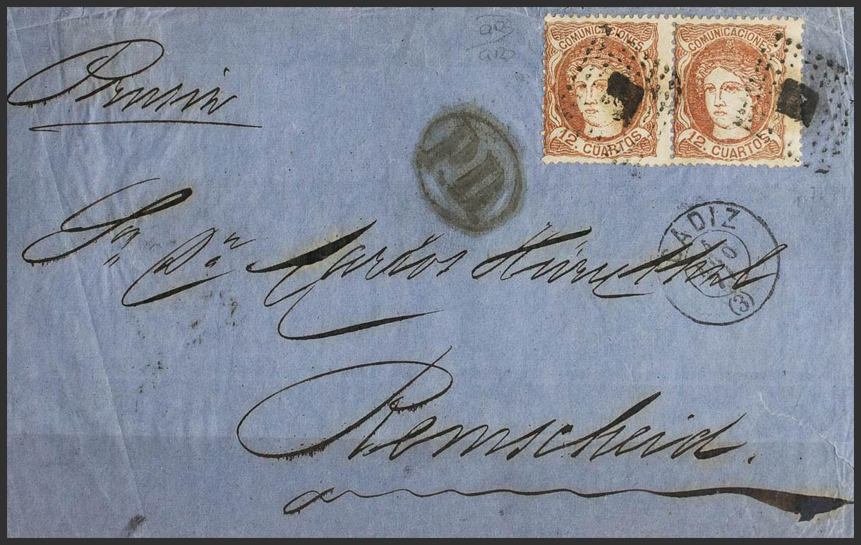 113(2). 1871. 12 cuartos castaño, pareja. Frontal de CADIZ a REMSCHEID (PRUSIA). MAGNIFICA Y RARA TARIFA DE 24 CUARTOS A PRUSIA.