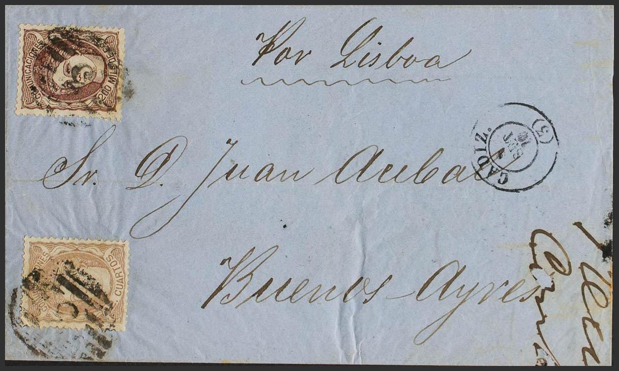 109, 113. 1870. 200 mils castaño y 12 cuartos castaño claro. CADIZ a BUENOS AIRES (ARGENTINA). Franqueo de 200 mils + 12 cuartos (150 mils) = 350 mils, según tarifa en vigor desde Agosto de 1867 por la vÃa de Portugal, que era la más económica para paises de Ultramar. MAGNIFICA E INUSUAL.