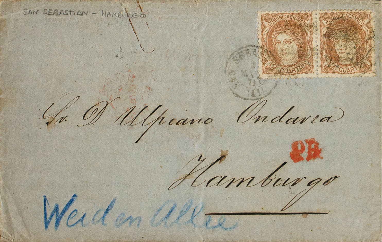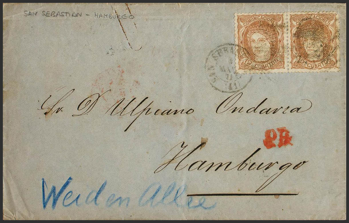 113(2). 1871. 12 cuartos castaño, pareja. SAN SEBASTIAN a HAMBURGO. Matasello SAN SEBASTIAN / (41). MAGNIFICA E INUSUAL TARIFA DE 24 CUARTOS A PRUSIA.