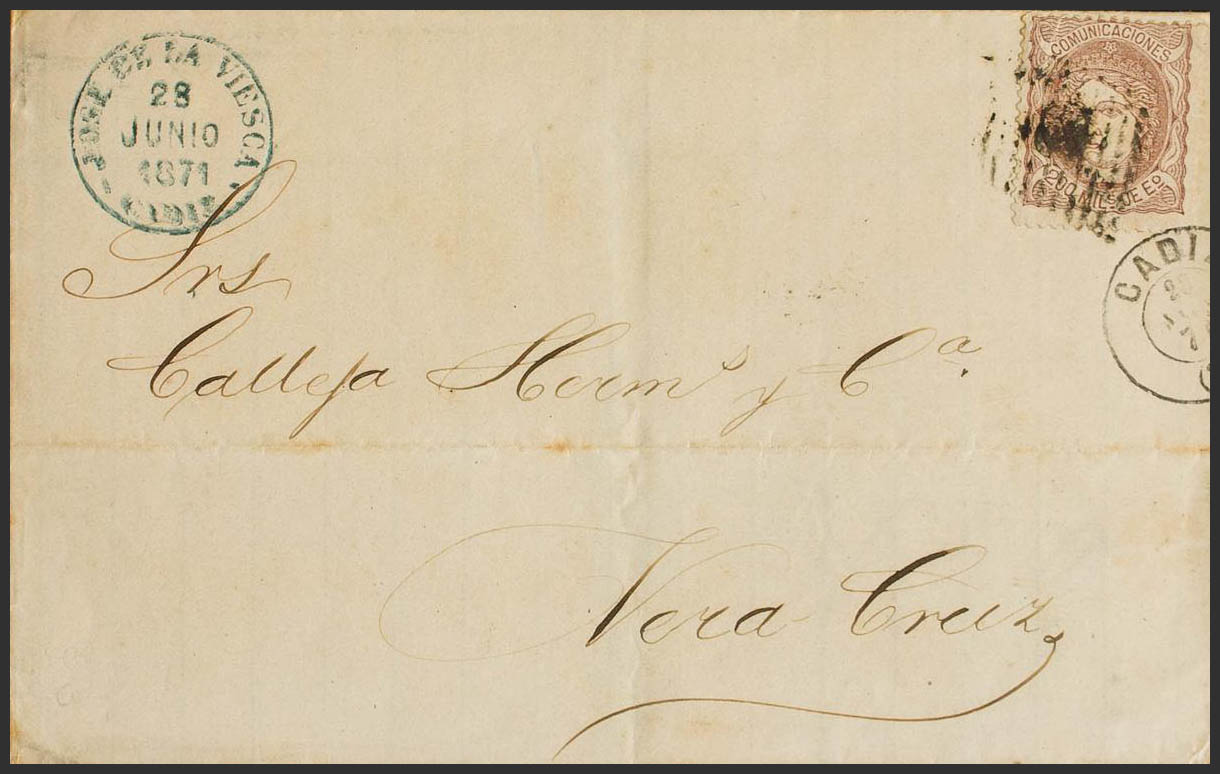 109. 1871. 200 mils castaño. CADIZ a VERACRUZ (MEXICO). MAGNIFICA E INUSUAL DESTINO.