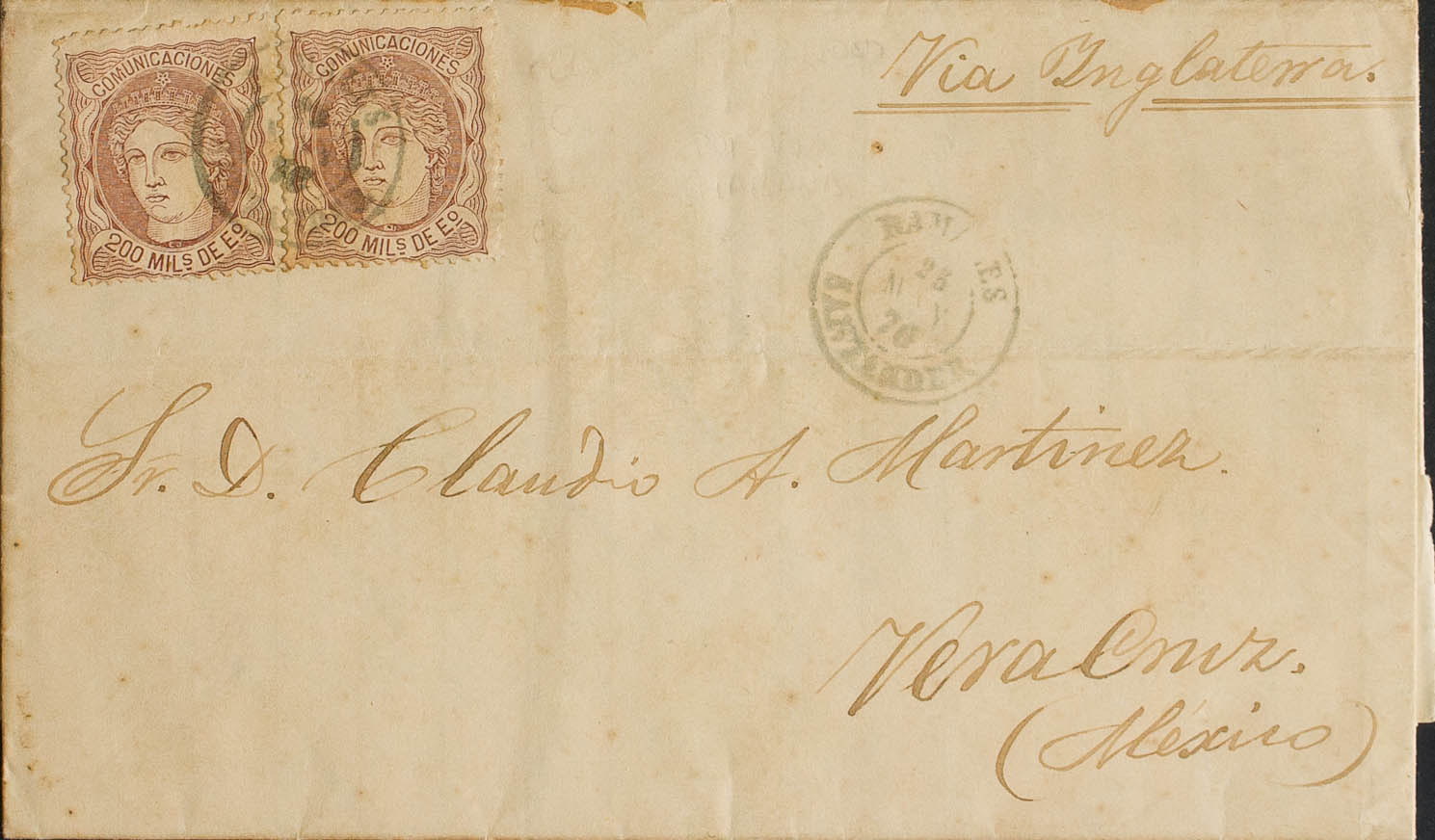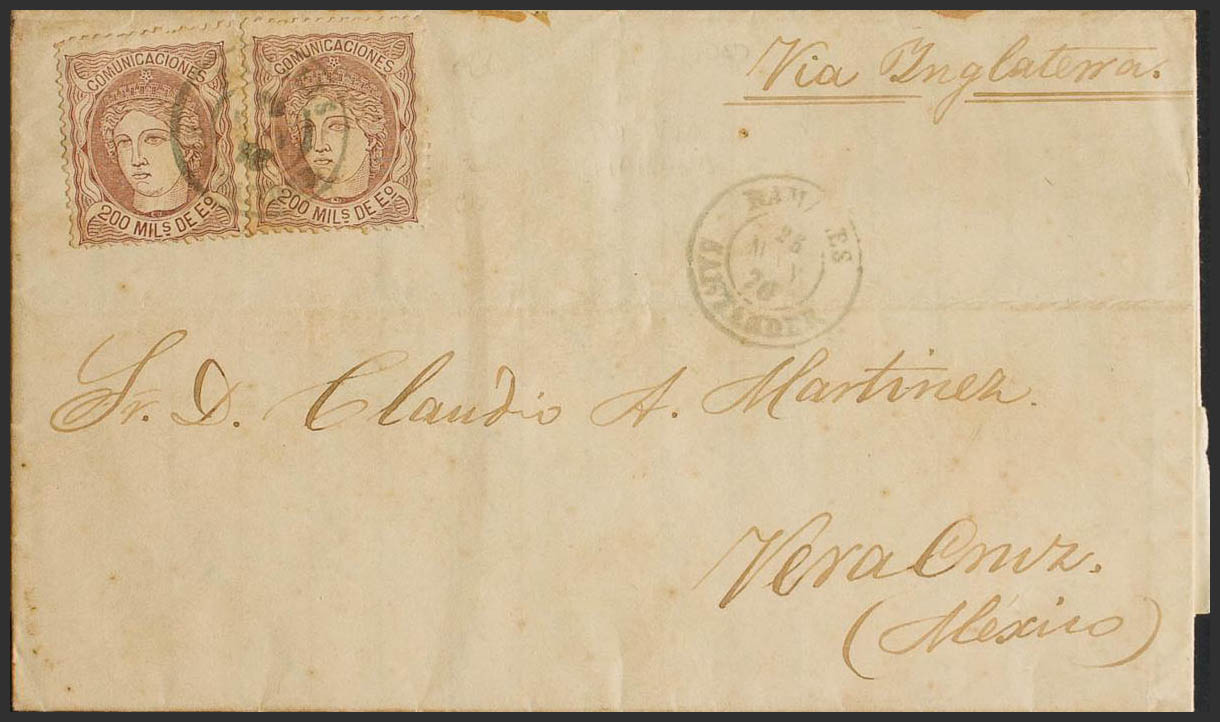 109(2). 1870. 200 mils castaño, dos sellos. RAMALES (SANTANDER) a VERACRUZ (MEXICO). MAGNIFICA E INUSUAL DESTINO Y CARTA DE DOBLE PORTE.