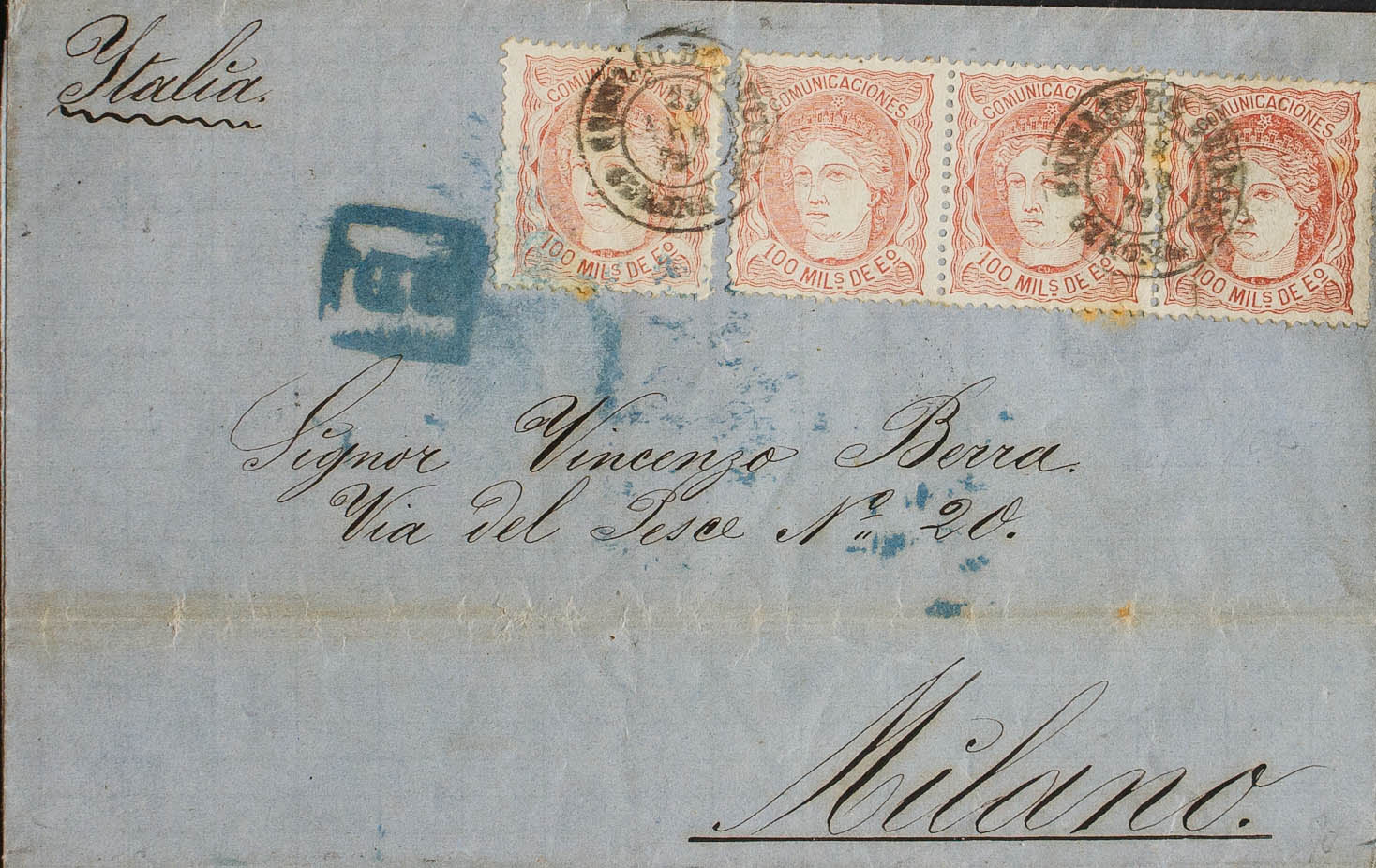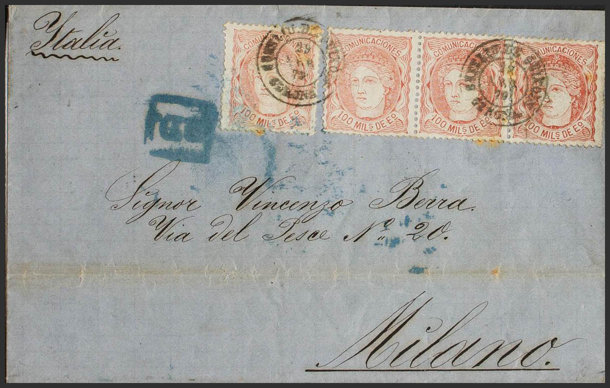 108(4). 1870. 100 mils rosa, cuatro sellos. SAN FELIU DE GUIXOLS a MILAN (ITALIA). Matasello S. FELIU DE GUIXOLS / GERONA. MAGNIFICA Y RARISIMO Y ESPECTACULAR FRANQUEO DE DOBLE PORTE.