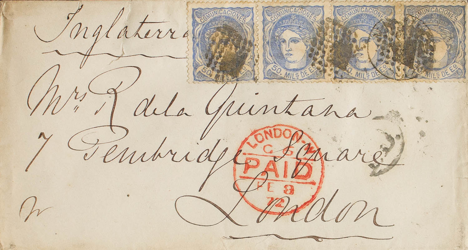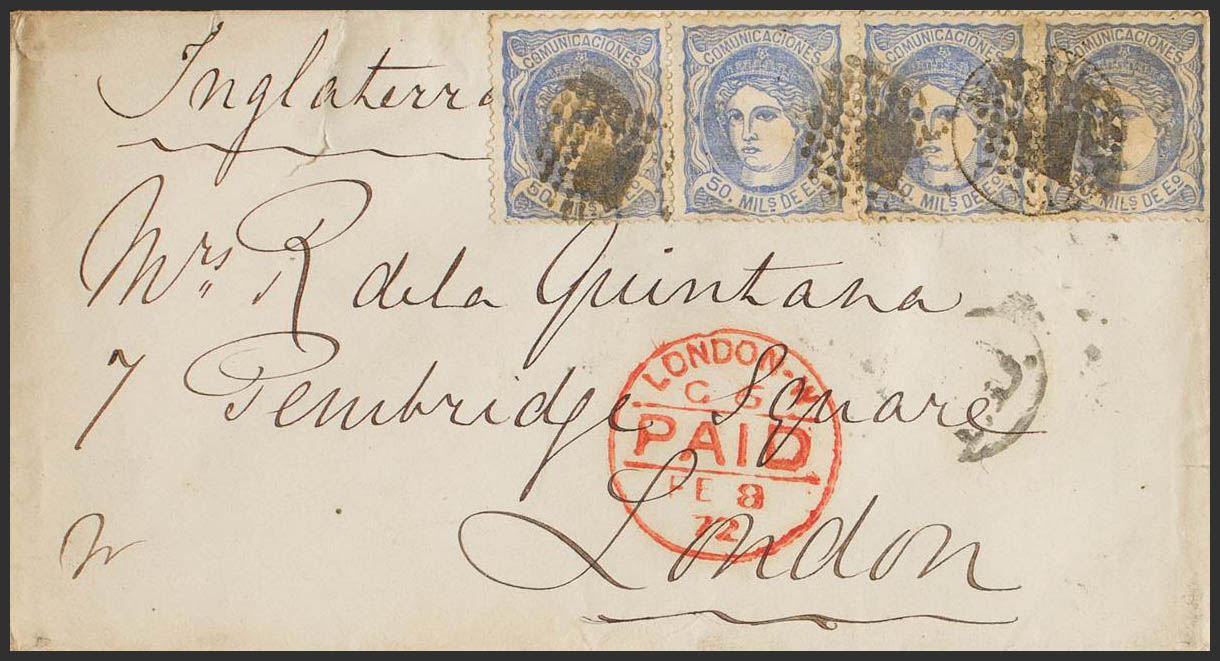 107(4). 1872. 50 mils ultramar, tira de cuatro sellos. MADRID a LONDRES (INGLATERRA). MAGNIFICA E INUSUAL COMBINACION DE FRANQUEO PARA COMPLETAR LA TARIFA DE 200 MILS.