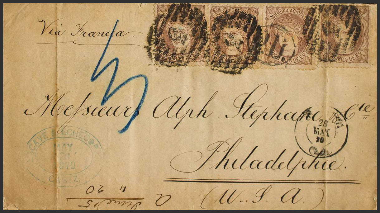 109(4). 1870. 200 mils castaño, cuatro sellos. CADIZ a PHILADELFIA (U.S.A.). MAGNIFICA Y RARO DOBLE PORTE.