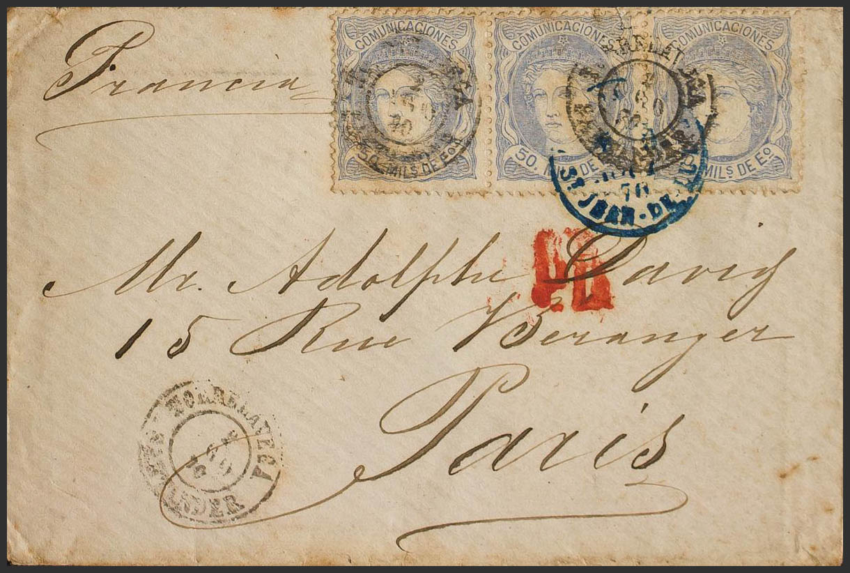107(3). 1870. 50 mils ultramar, tira de tres. TORRELAVEGA a PARIS (FRANCIA). MAGNIFICA E INUSUAL COMBINACION PARA COMPONER LA TARIFA A FRANCIA DE 150 MILS.