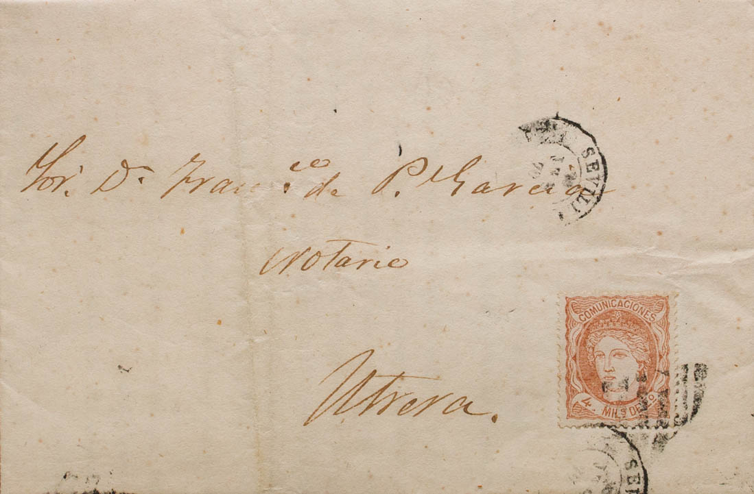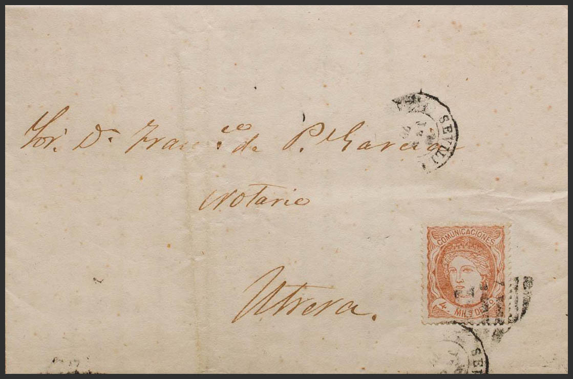 104. 1870. 4 mils castaño. SEVILLA a UTRERA. Tarifa de Impresos. MAGNIFICA.