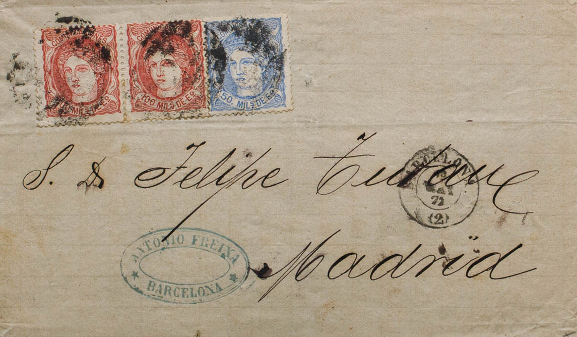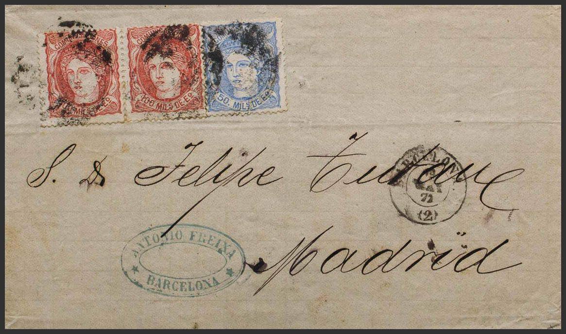 107, 108(2). 1871. 50 mils azul y 100 mils castaño, dos sellos. BARCELONA a MADRID. MAGNIFICA Y RARISIMA CARTA DE CINCO PORTES.