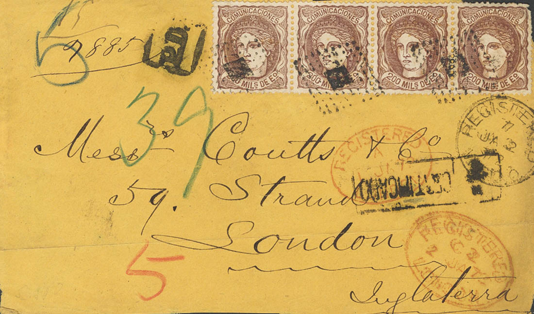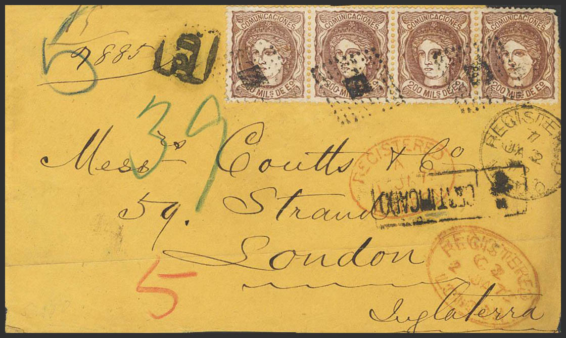 109(4). 1872. 200 mils castaño, tira de cuatro. Frente de Certificado dirigido a LONDRES (GRAN BRETAÑA). En el frente marca rectangular R / CERTIFICADO y llegada. MAGNIFICA Y RARISIMA.