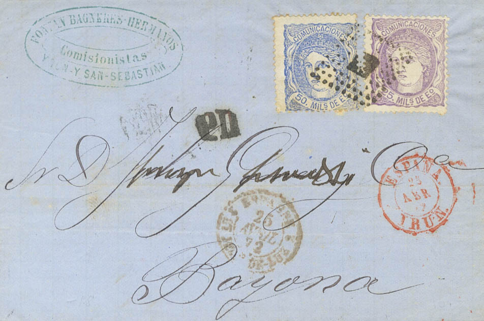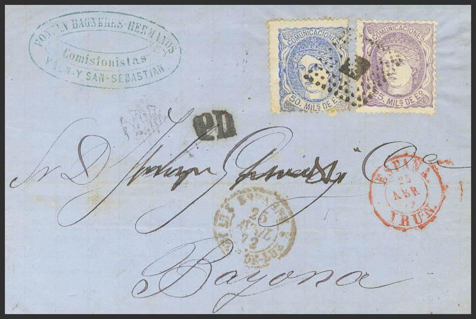106, 107. 1872. 25 mils lila y 50 mils ultramar. IRUN a BAYONA (FRANCIA). MAGNIFICA Y MUY RARO FRANQUEO FRONTERIZO.