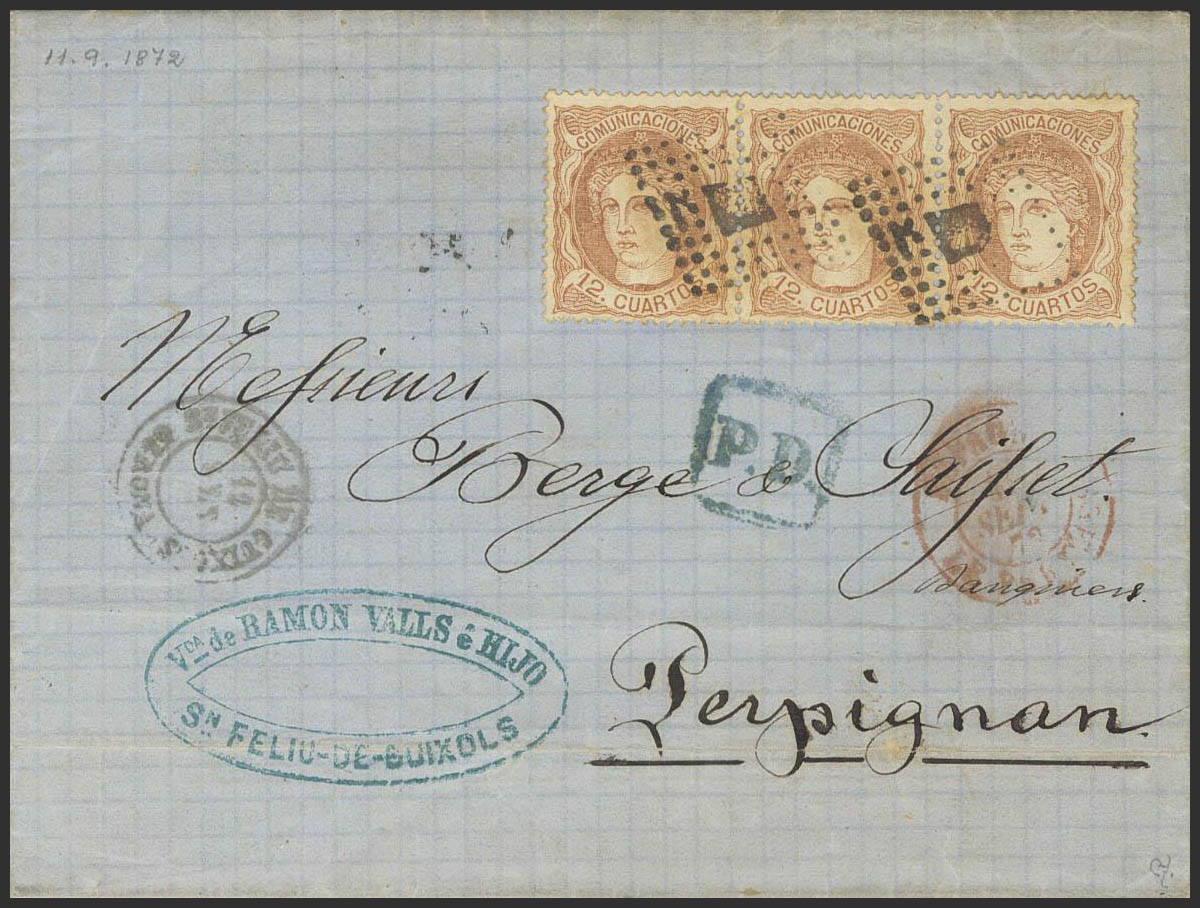 113(3). 1872. 12 cuartos castaño rojizo, tira de tres. SAN FELIU DE GUIXOLS a PERPIÑAN (FRANCIA). MAGNIFICA Y RARO FRANQUEO DE TRIPLE PORTE.