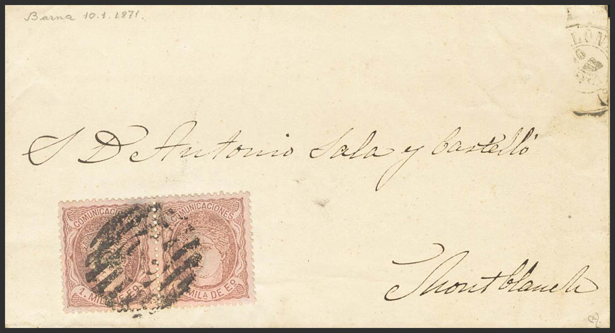 102(2). 1871. 1 mils violeta, pareja. BARCELONA a MONTBLANCH (TARRAGONA). Franqueo de doble porte de impresos (1 mils por cada 5 gramos). MAGNIFICA Y MUY RARA.