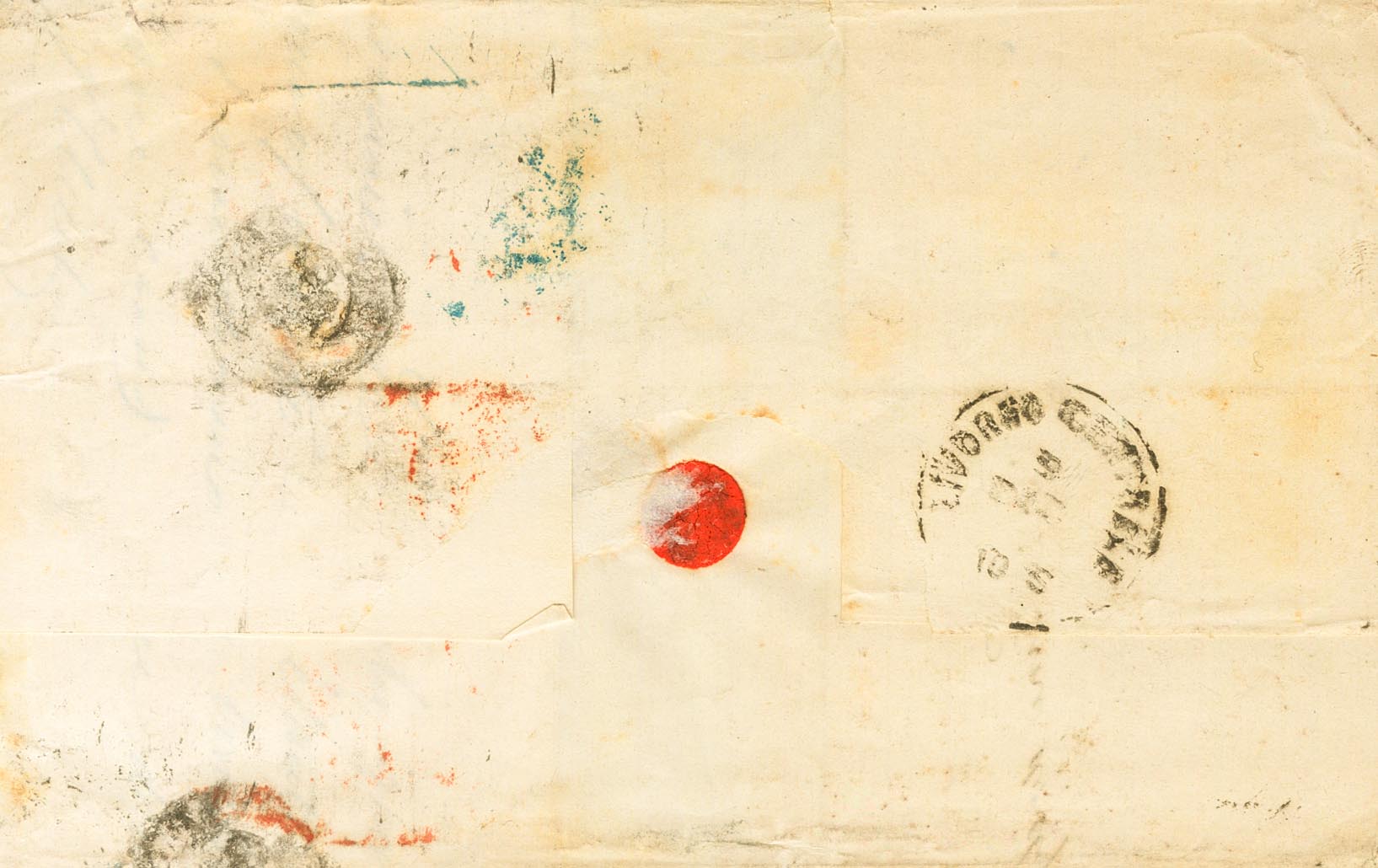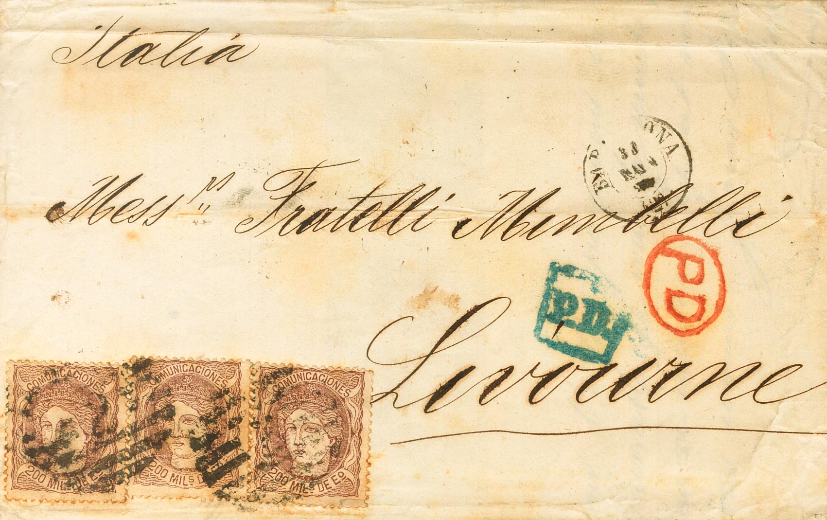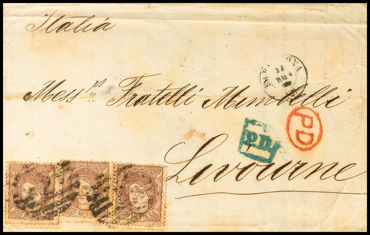 109(3). 1870. 200 mils castaño, tres sellos. BARCELONA a LIVORNO (ITALIA). MAGNIFICA Y RARISIMO TRIPLE PORTE.