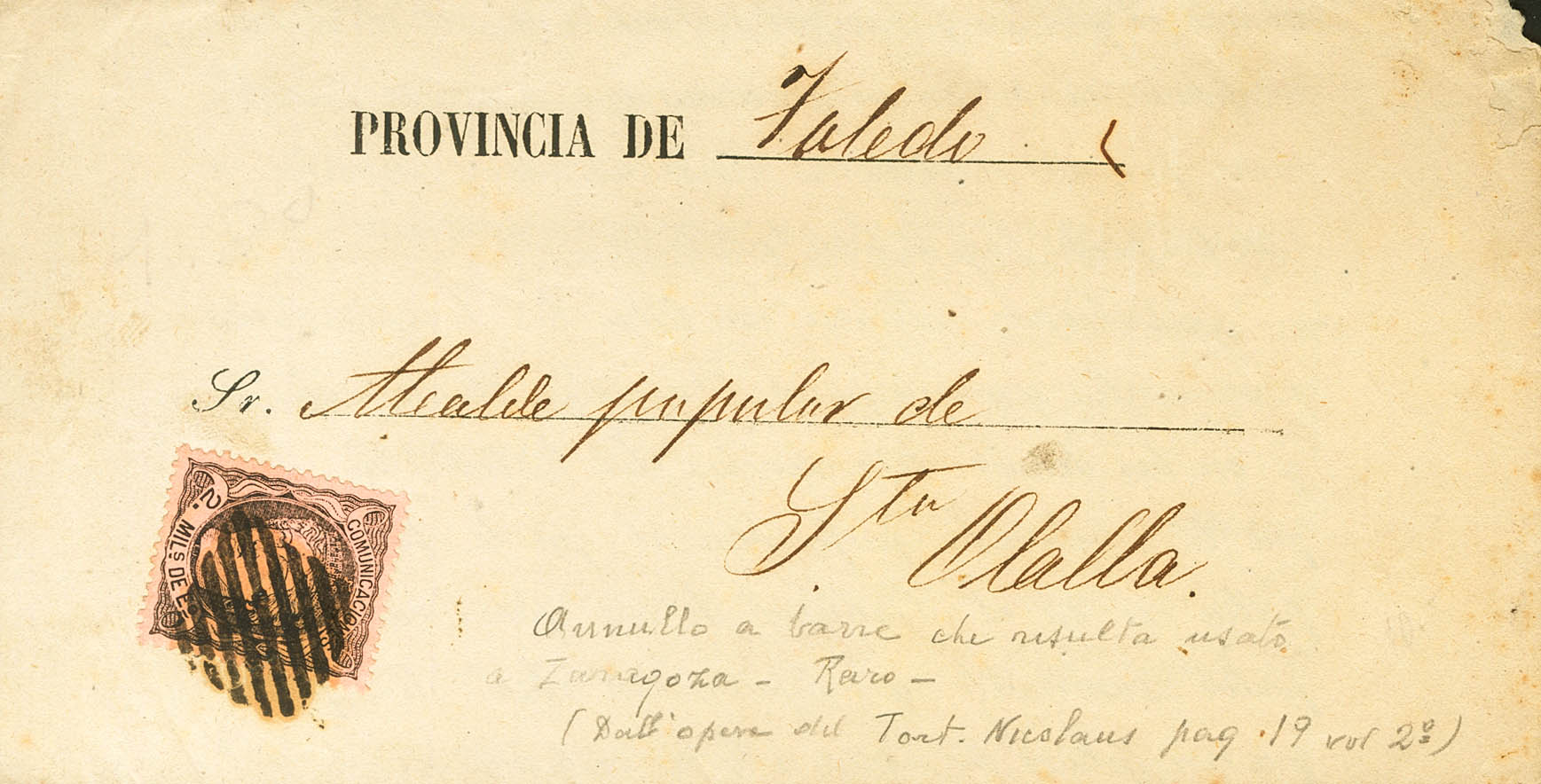 103. 1871. (1 de Mayo). 2 mils negro sobre rosa. Impreso de MADRID a SANTA OLALLA (TOLEDO). MAGNIFICA E INUSUAL TARIFA DE IMPRESOS.