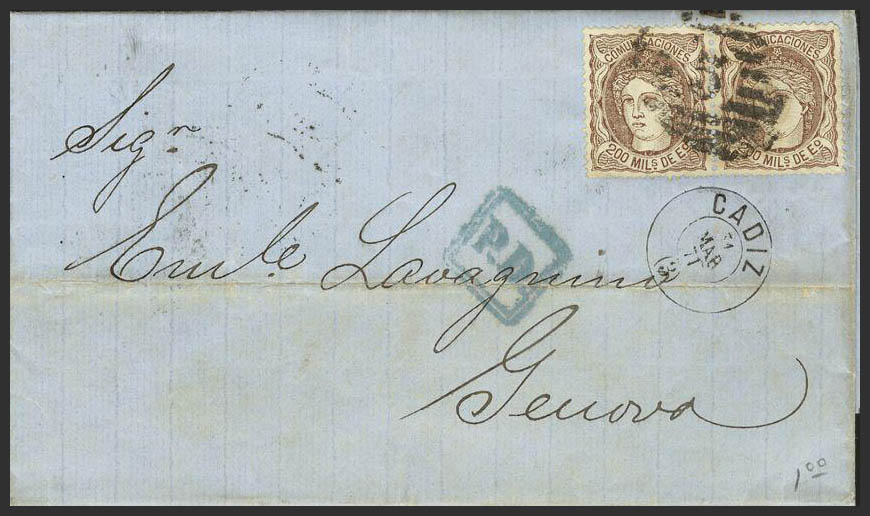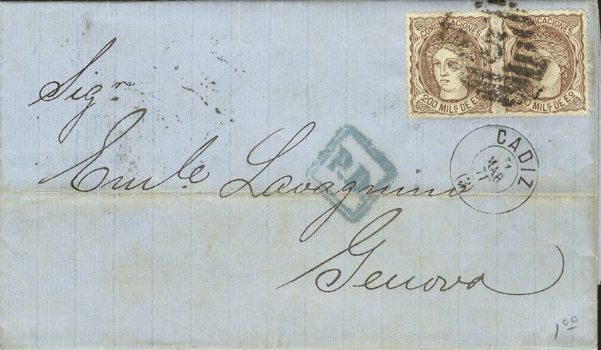 109(2). 1871. 200 mils castaño, pareja. CADIZ a GENOVA. Doble porte. MAGNIFICA.