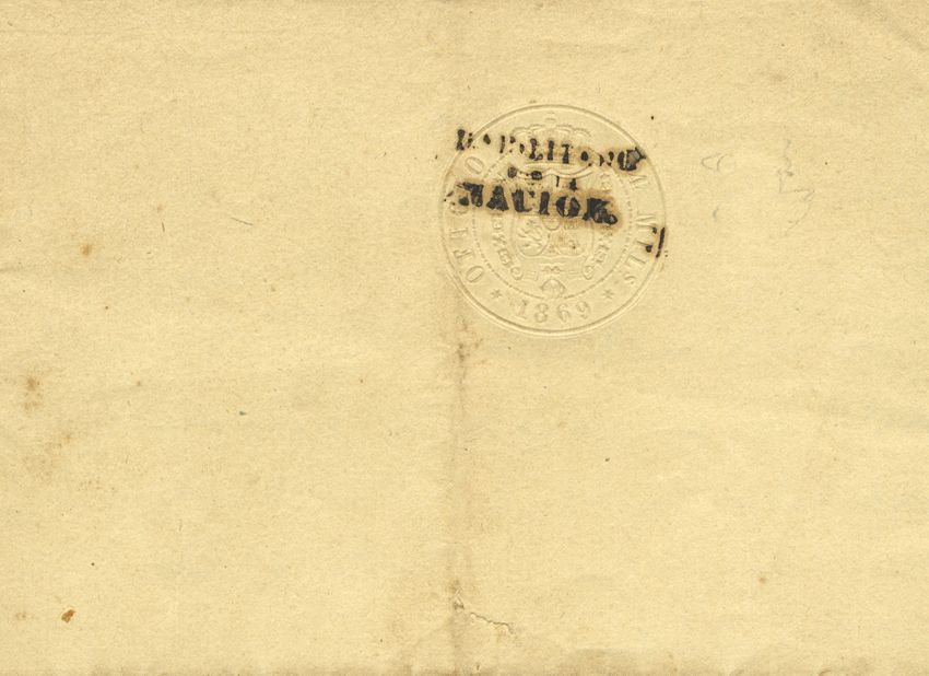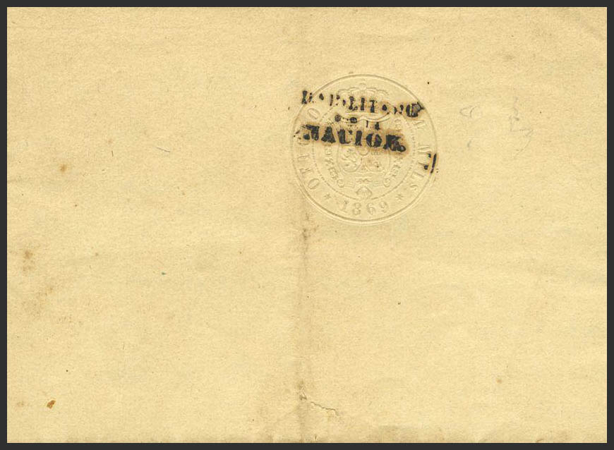 1869. 4 mils sello seco HABILITADO / POR / LA / NACION, sobre bando Municipal de RUBIELOS. MAGNIFICO Y RARO.