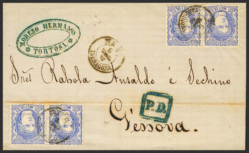 107(4). 1870. 50 mils ultramar, dos parejas. TORTOSA a GENOVA. MAGNIFICA Y RARA.
