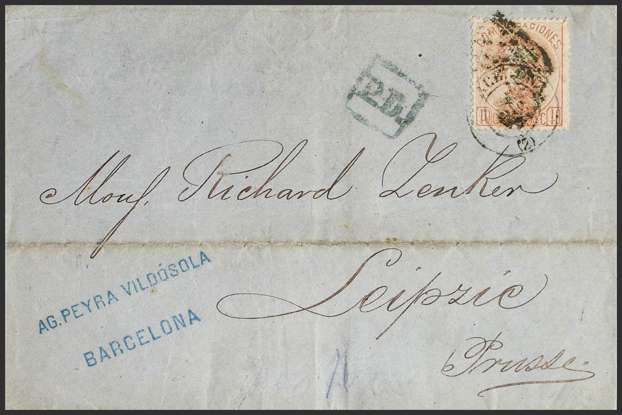 125. 1872. 40 cts castaño. BARCELONA a LEIPZIG (ALEMANIA). MAGNIFICA E INUSUAL DESTINO A PRUSIA.