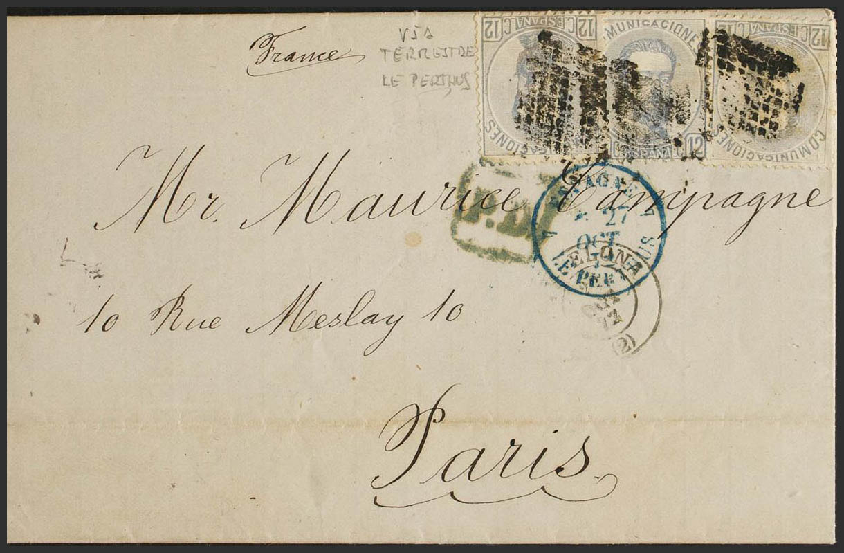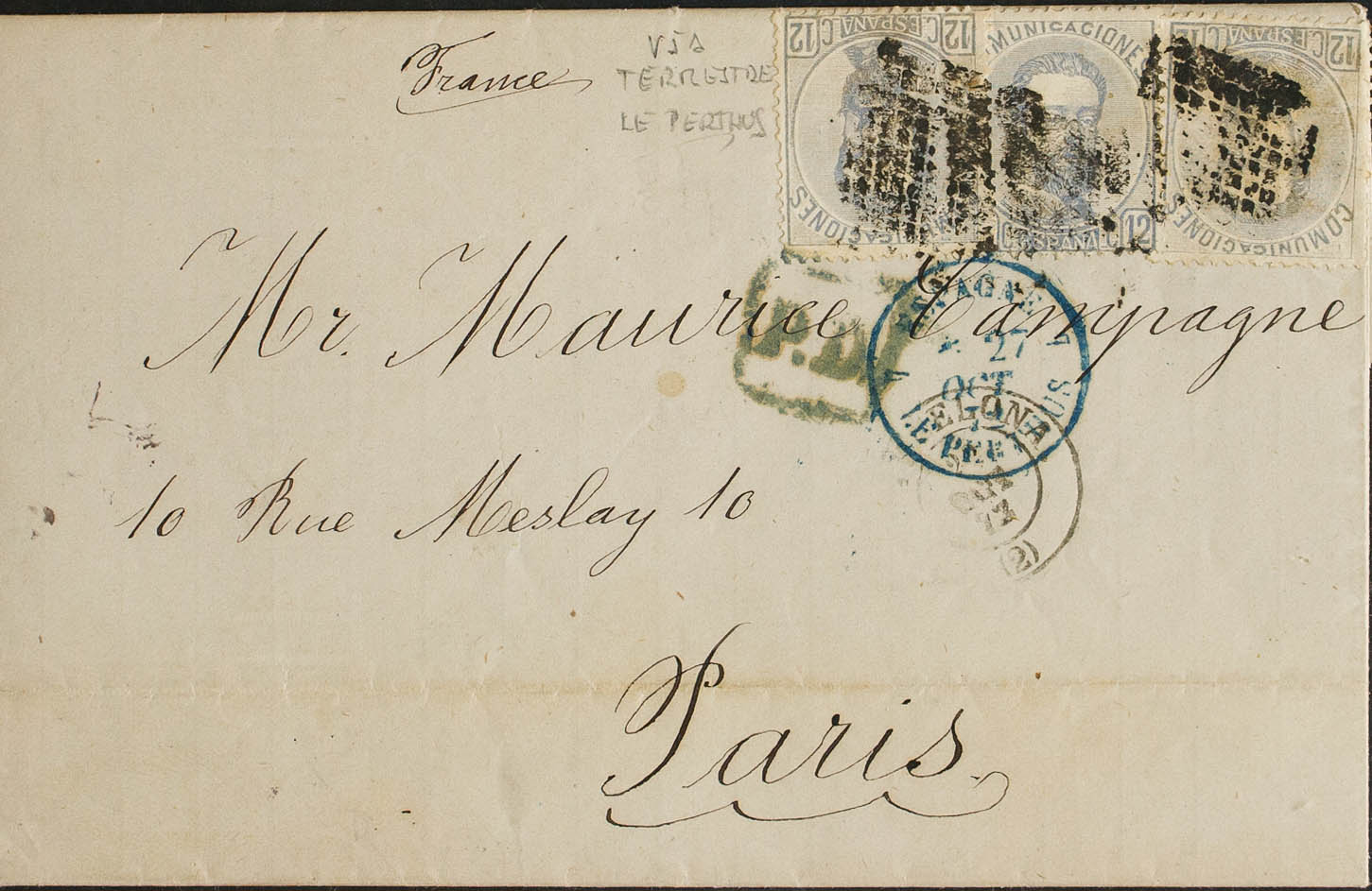 122(3). 1872. 12 cts gris lila, tres sellos. BARCELONA a PARIS (FRANCIA). Franqueada con la tarifa de 36 cts (150 mils) a Francia (a falta de un 1 cts), que estuvo en vigor hasta el 31 de Diciembre de 1873. MAGNIFICA Y RARA.