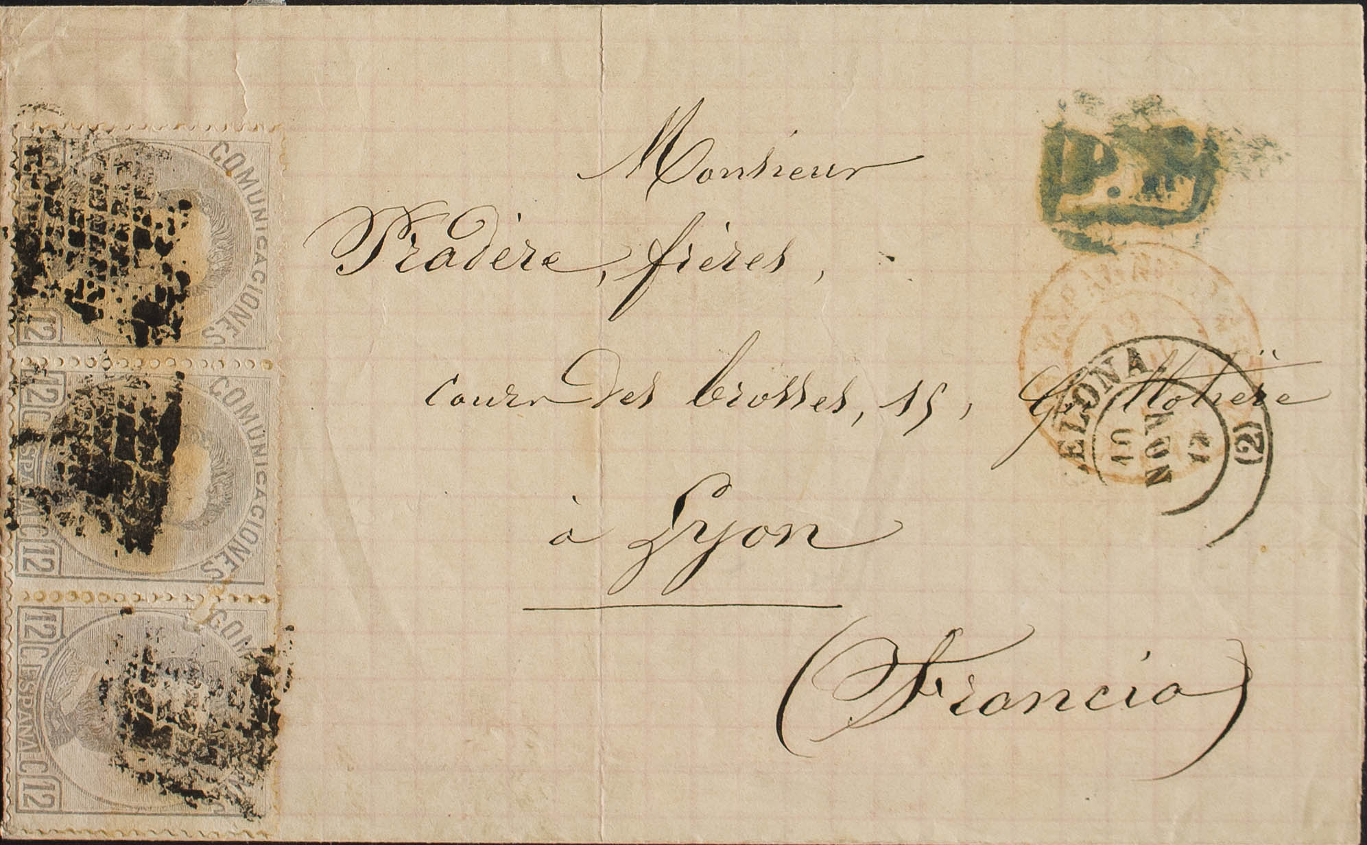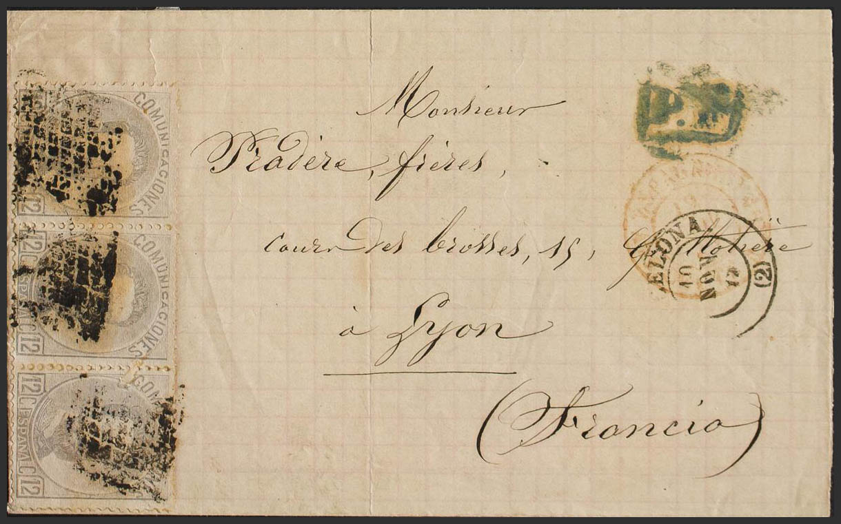122(3). 1872. 12 cts lila gris, tira de tres. BARCELONA a LYON (FRANCIA). Franqueada con la tarifa de 36 cts a Francia (correspondientes a 150 mils), que estuvo en vigor hasta el 1 de enero de 1873. MAGNIFICA E INUSUAL FRANQUEO.