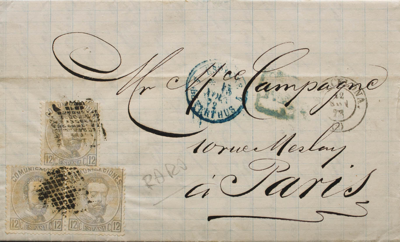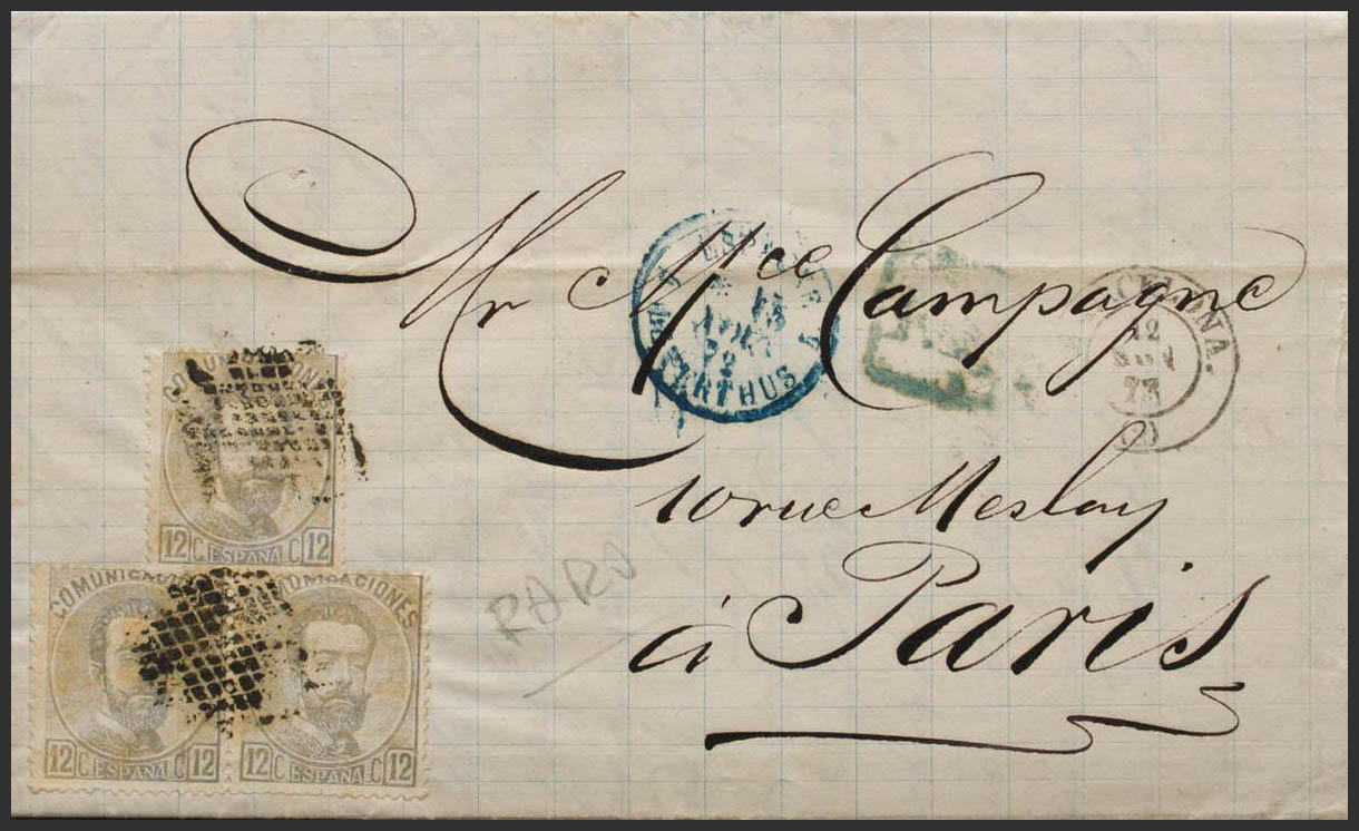 122(3). 1872. 12 cts lila gris, tira de tres. BARCELONA a PARIS (FRANCIA). Franqueada con la tarifa de 36 cts a Francia (correspondientes a 150 mils), que estuvo en vigor hasta el 1 de enero de 1873. MAGNIFICA E INUSUAL FRANQUEO.