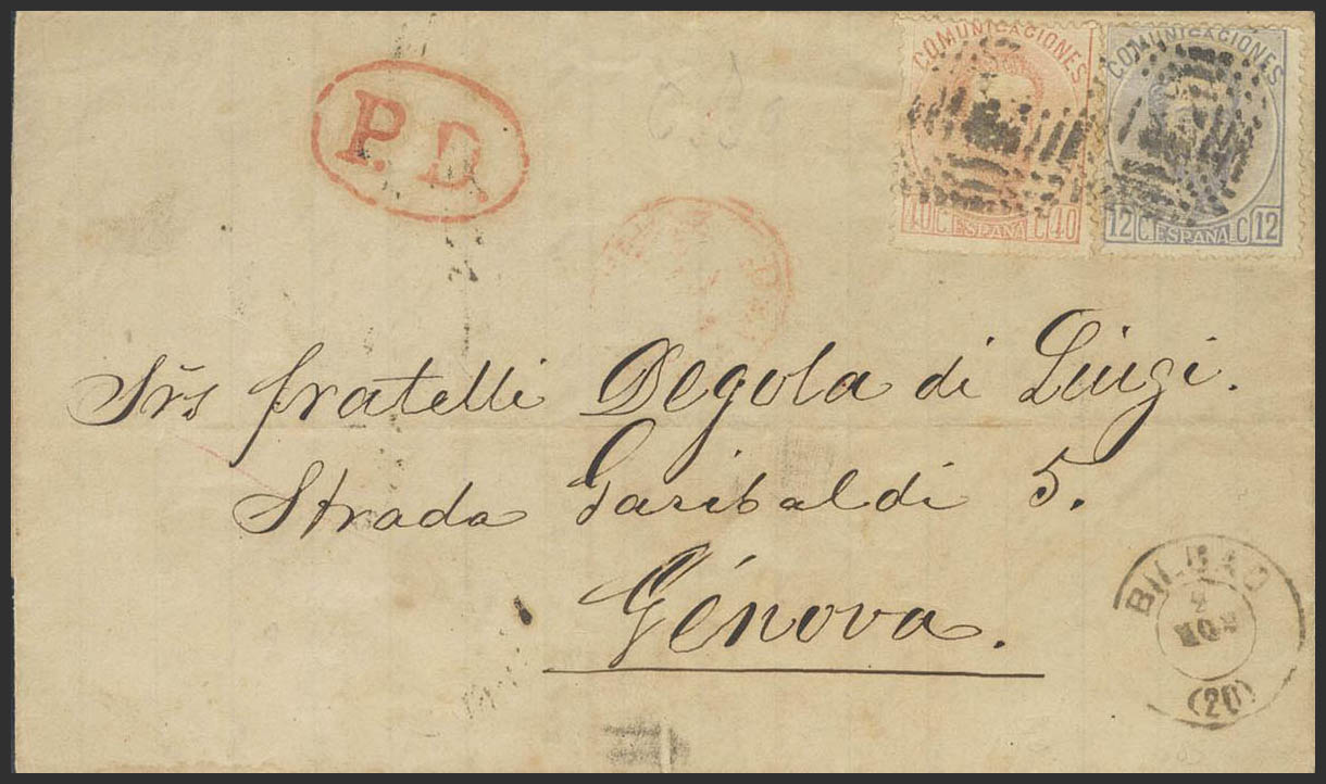 122, 125. 1872. 12 cts lila gris y 40 cts castaño. BILBAO a GENOVA (ITALIA). Matasello ROMBO DE PUNTOS, de Bilbao. MAGNIFICA Y EXTRAORDINARIAMENTE RARA COMBINACION DE FRANQUEO PARA COMPLETAR LA TARIFA DE 50 CTS A ITALIA CON EXCESO DE 2 CTS, POSIBLEMENTE UNICA.