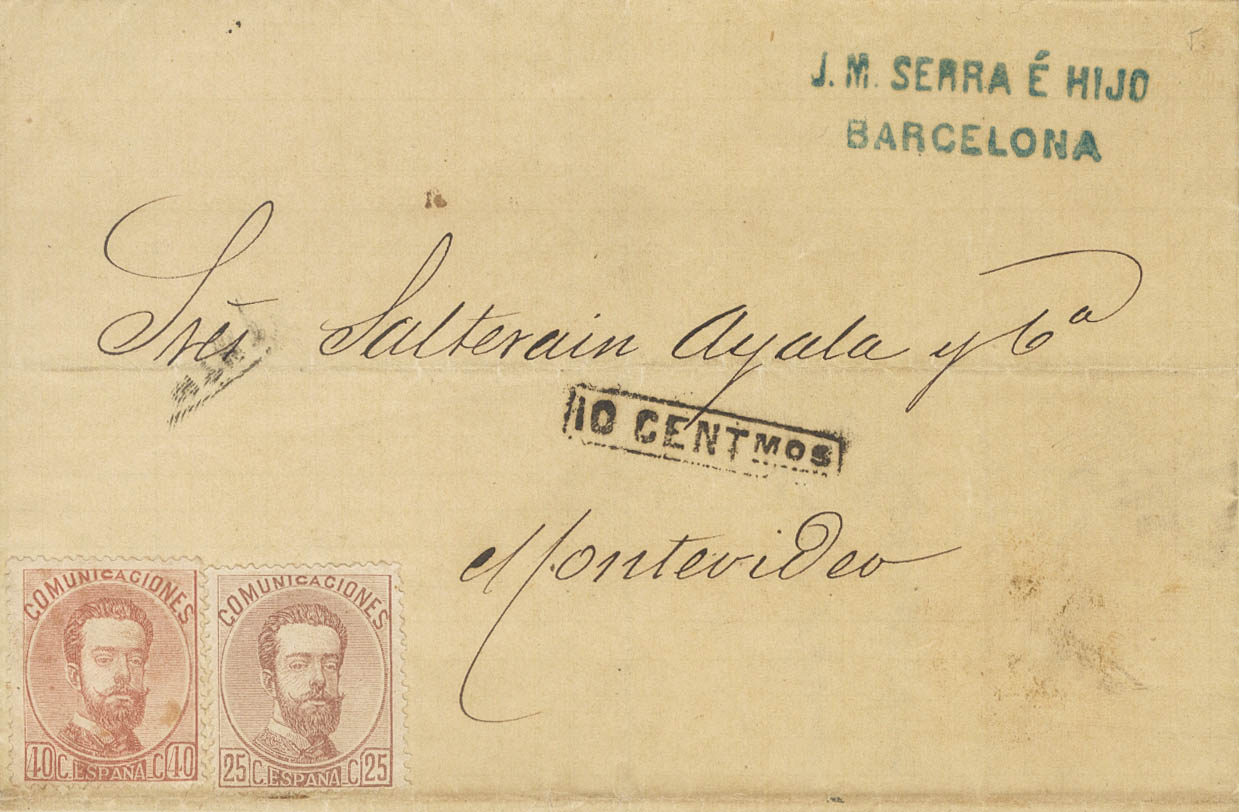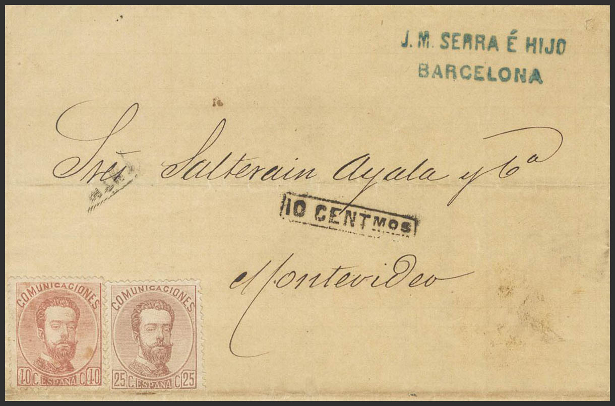 124, 125. 1873. 25 cts y 40 cts. BARCELONA a MONTEVIDEO (URUGUAY), sellos sin inutilizar, al ser depositada la carta directamente en el buzón del barco. Al llegar a Uruguay se tasa internamente con la marca 10 CENTMOS. MAGNIFICA Y MUY RARO DESTINO.