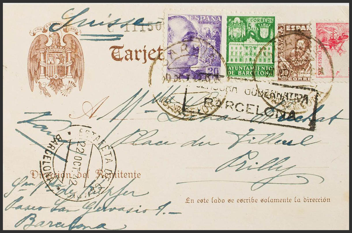 EP83, 917, 922. 1942. 20 cts castaño sobre Tarjeta Entero Postal de BARCELONA a PRILLY (SUIZA), con franqueo complementario de 10 cts rosa, 20 cts violeta y 5 cts verde Ayuntamiento de Barcelona. MAGNIFICA.