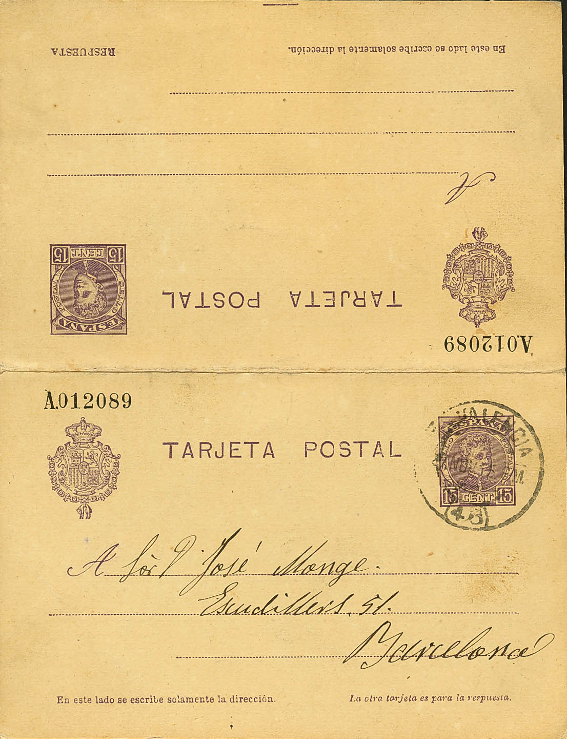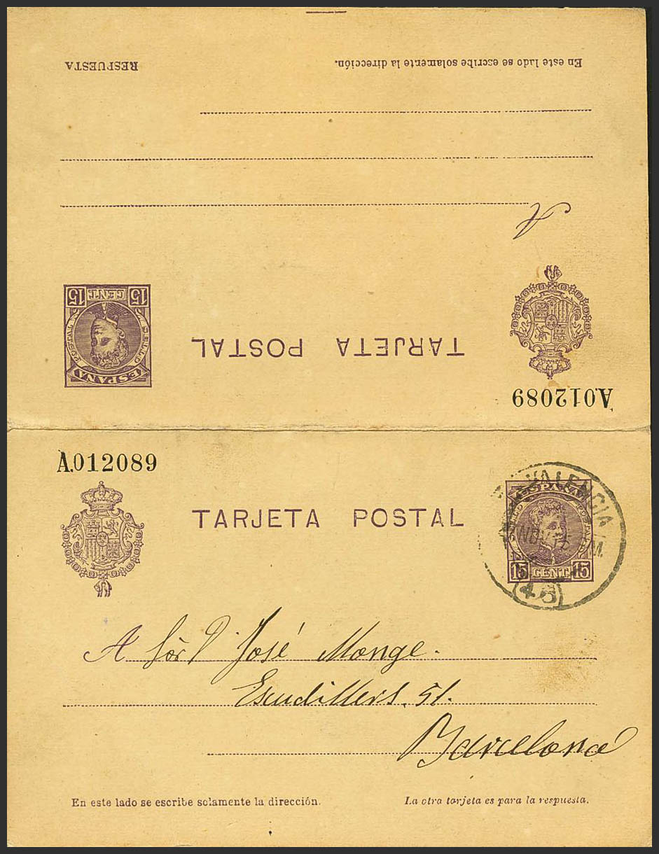EP46. 1915. 15 cts + 15 cts violeta sobre Tarjeta Entero Postal de ida y vuelta circulada sólo a la ida de VALENCIA a BARCELONA. MAGNIFICA.