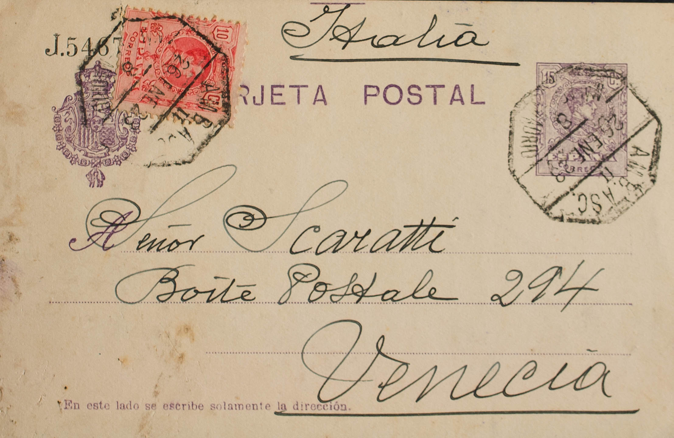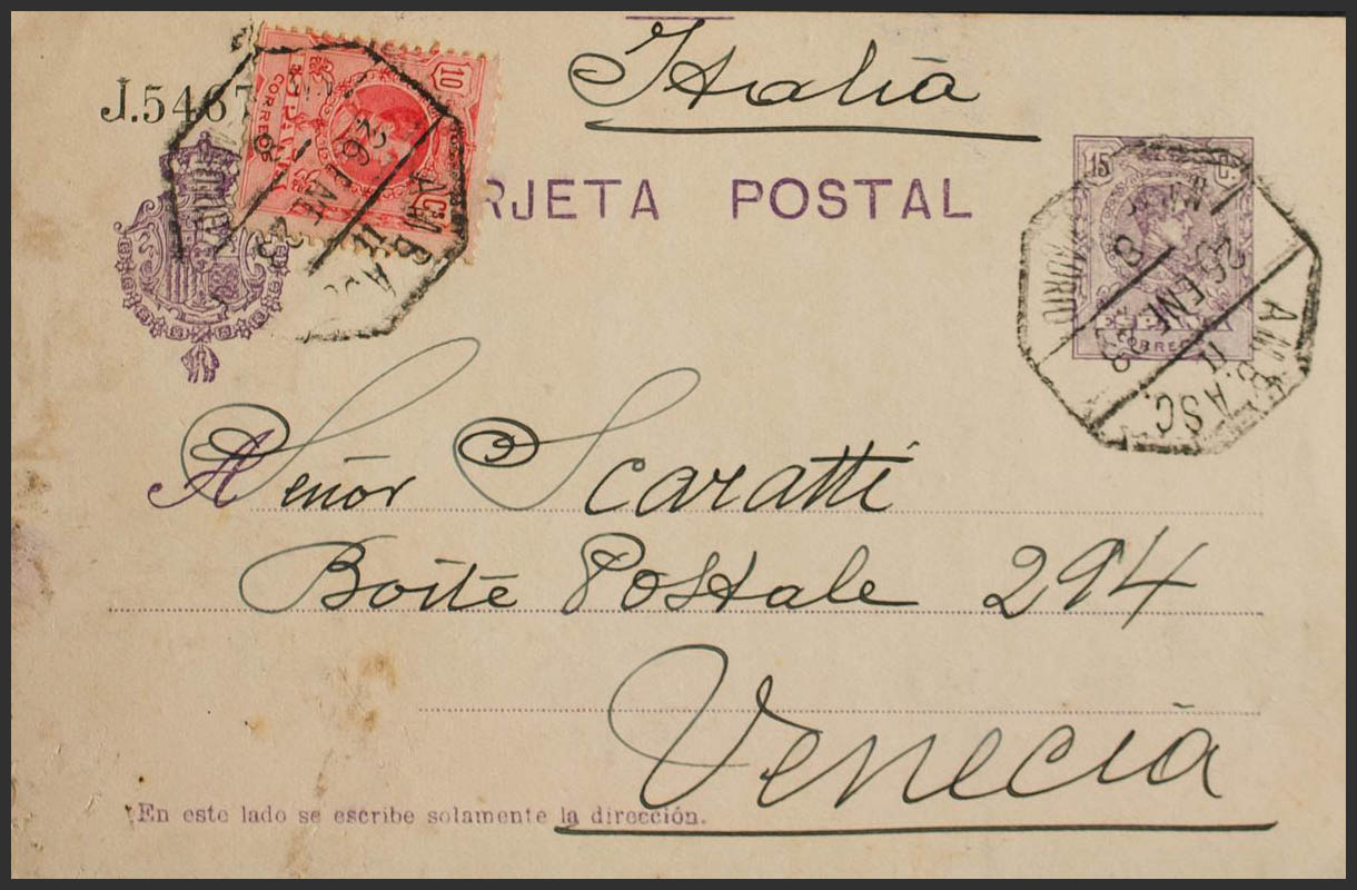 EP50, 269. 1923. 15 cts violeta sobre Tarjeta Entero Postal de MALAGA a VENECIA (ITALIA), con franqueo complementario de 10 cts rojo. MAGNIFICA E INUSUAL DESTINO.