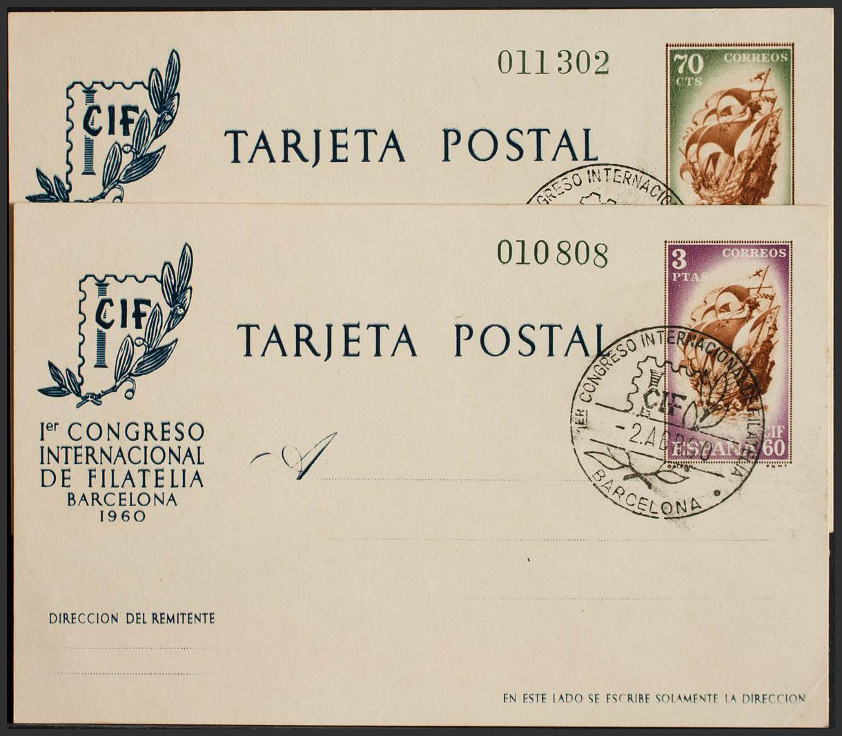 EP88/89. 1960. Tarjetas Entero Postales. Matasello del Congreso Internacional de Filatelia de 1960, en Barcelona. MAGNIFICA. Edifil 2017: 55 Euros