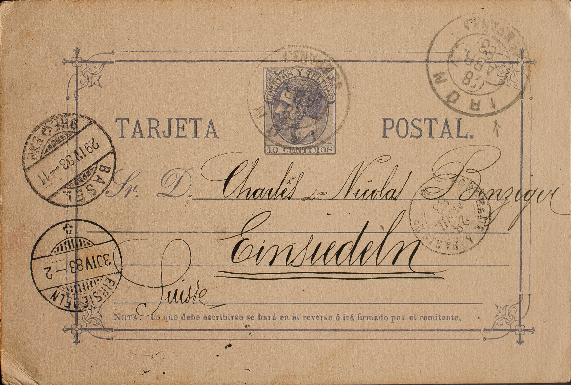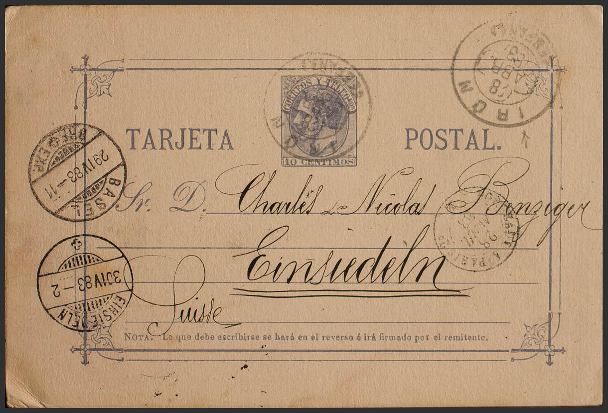 EP11. 1883. 10 cts violeta gris sobre Tarjeta Entero Postal de IRUN a EINSIEDELN (ALEMANIA). MAGNIFICA.