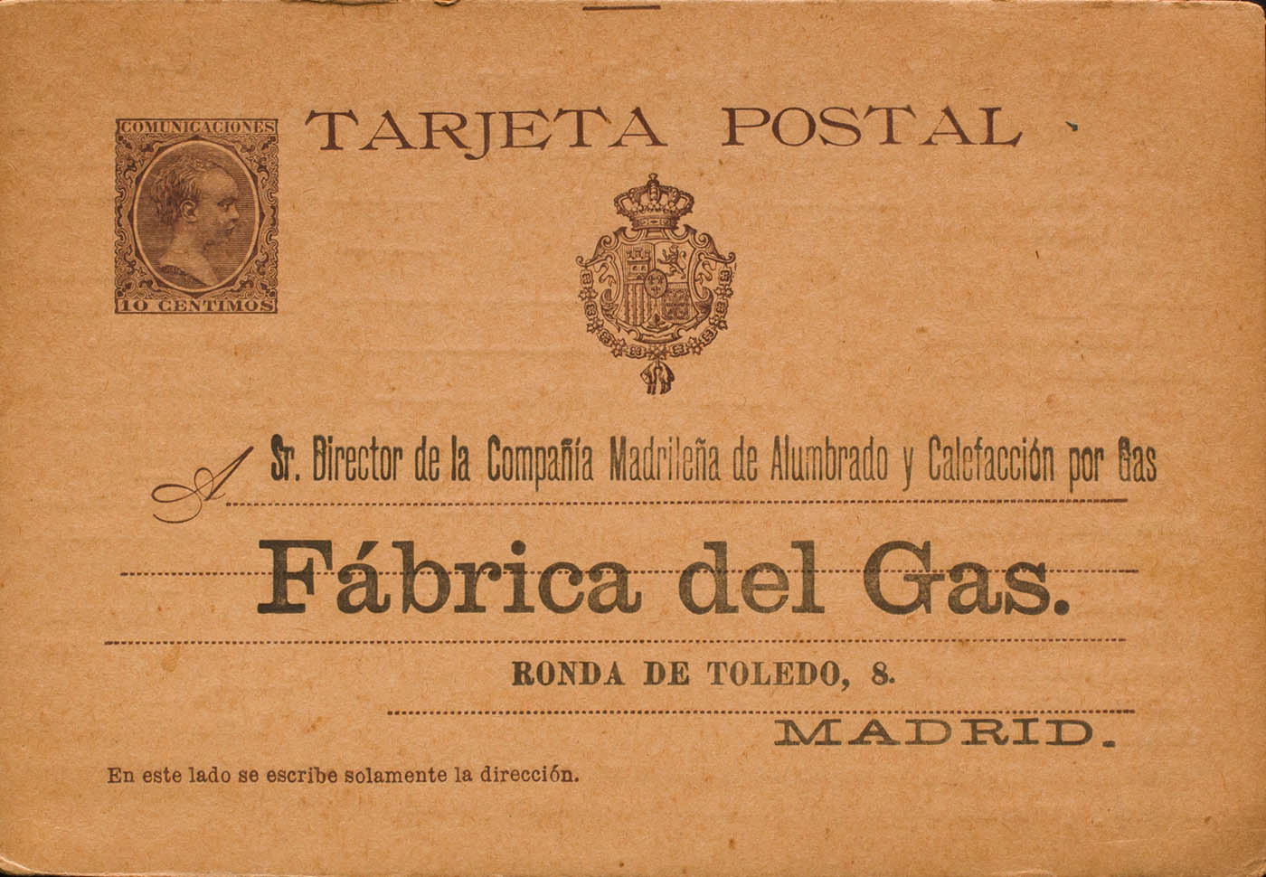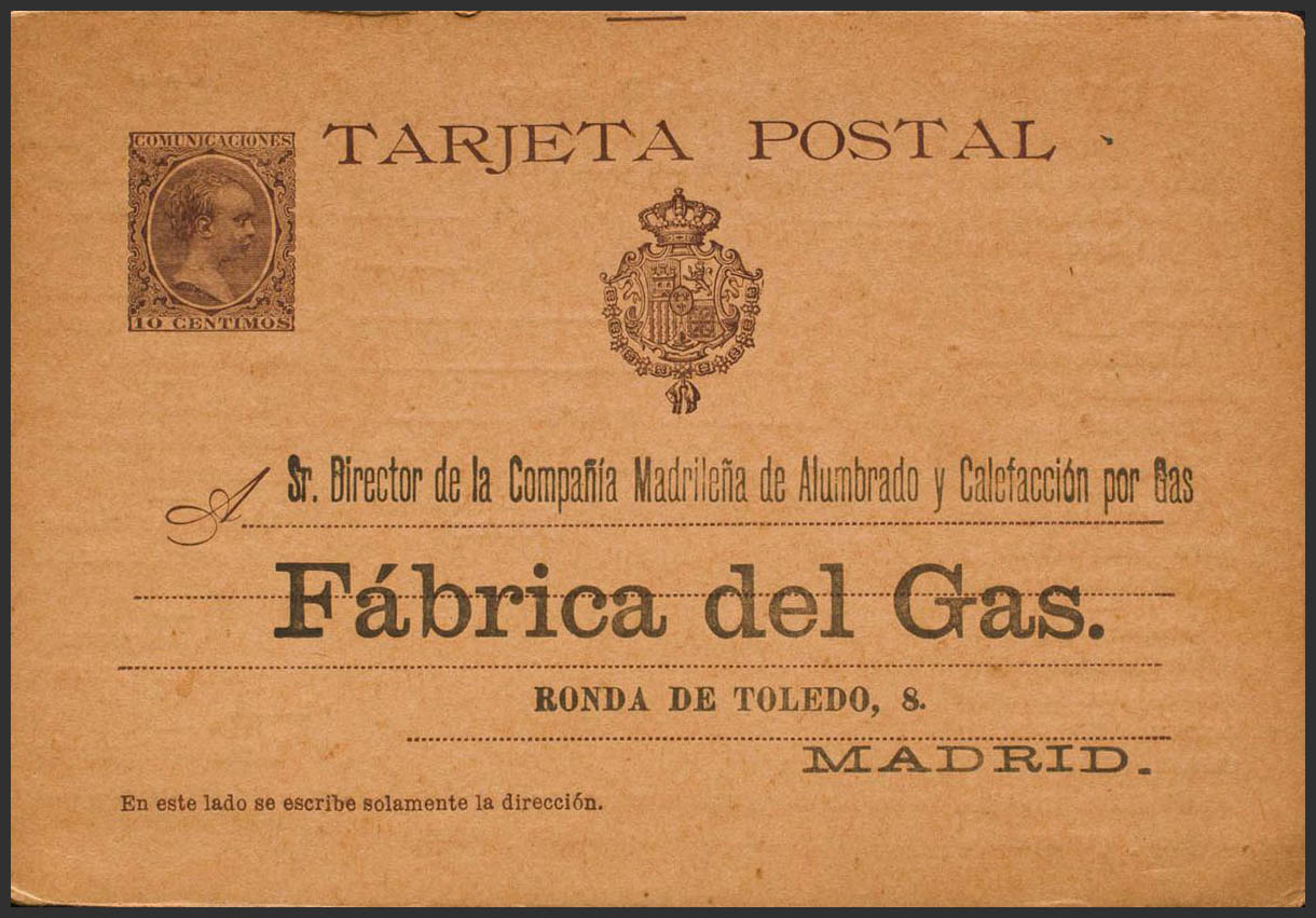 (★) EP36. 1897. 10 cts castaño sobre Tarjeta Entero Postal con Preimpresión Privada FABRICA DEL GAS, en anverso y reverso. MAGNIFICA Y MUY RARA.