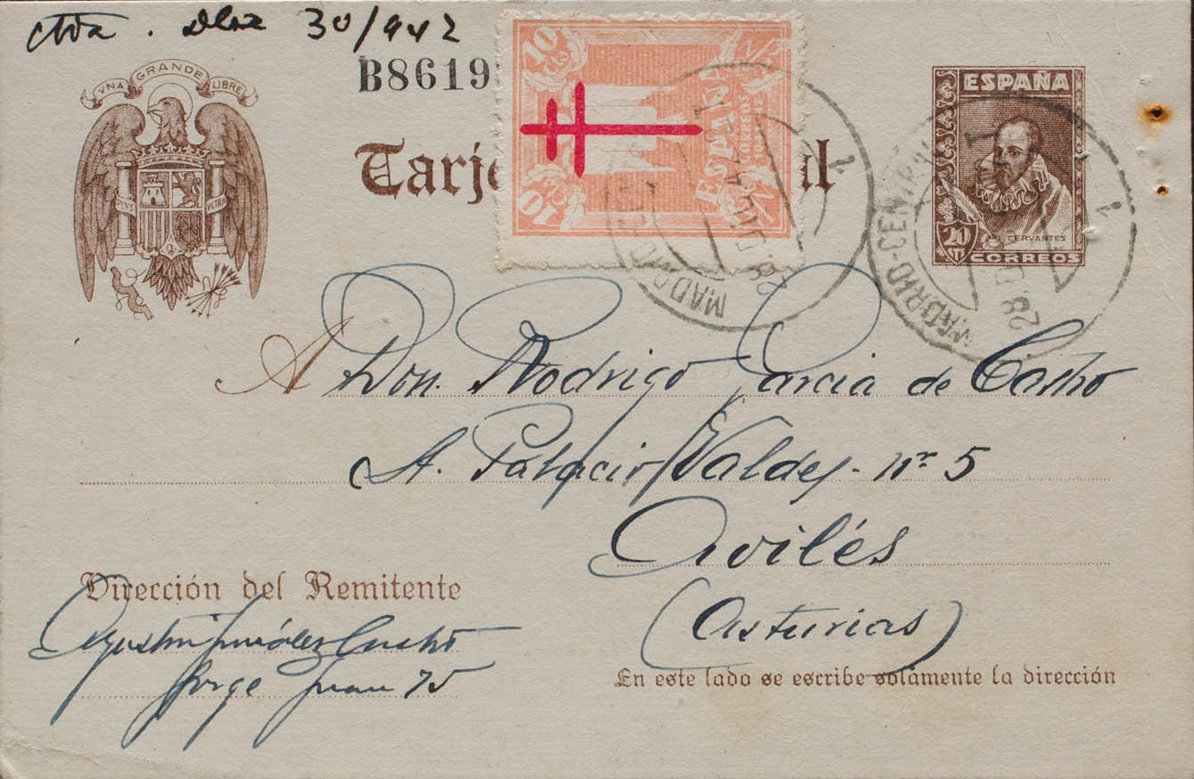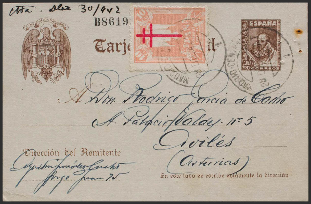 EP86, 957. 1942. 20 cts castaño sobre Tarjeta Entero Postal de MADRID a AVILES, con franqueo complementario de 10 cts salmón (Pro Tuberculosos). MAGNIFICA E INUSUAL FRANQUEO.
