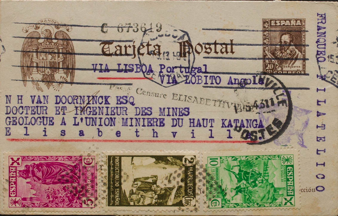 EP86. 1943. 20 cts castaño sobre Tarjeta Entero Postal de PEÑAMEFECIT (JAEN) a ELISABETHVILLE (KATANGA), con franqueo complementario de diversos valores de Beneficencia y Marruecos, circulada vía Lisboa y Lobito (Angola). En el frente tránsito y llegada. MAGNIFICA Y RARISIMA COMBINACION DE FRANQUEO E INUSUAL DESTINO.