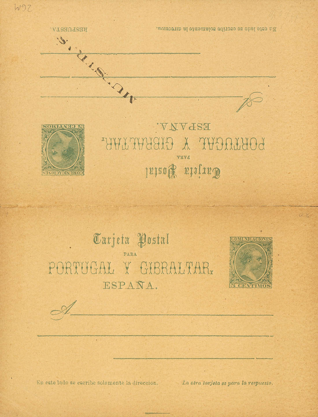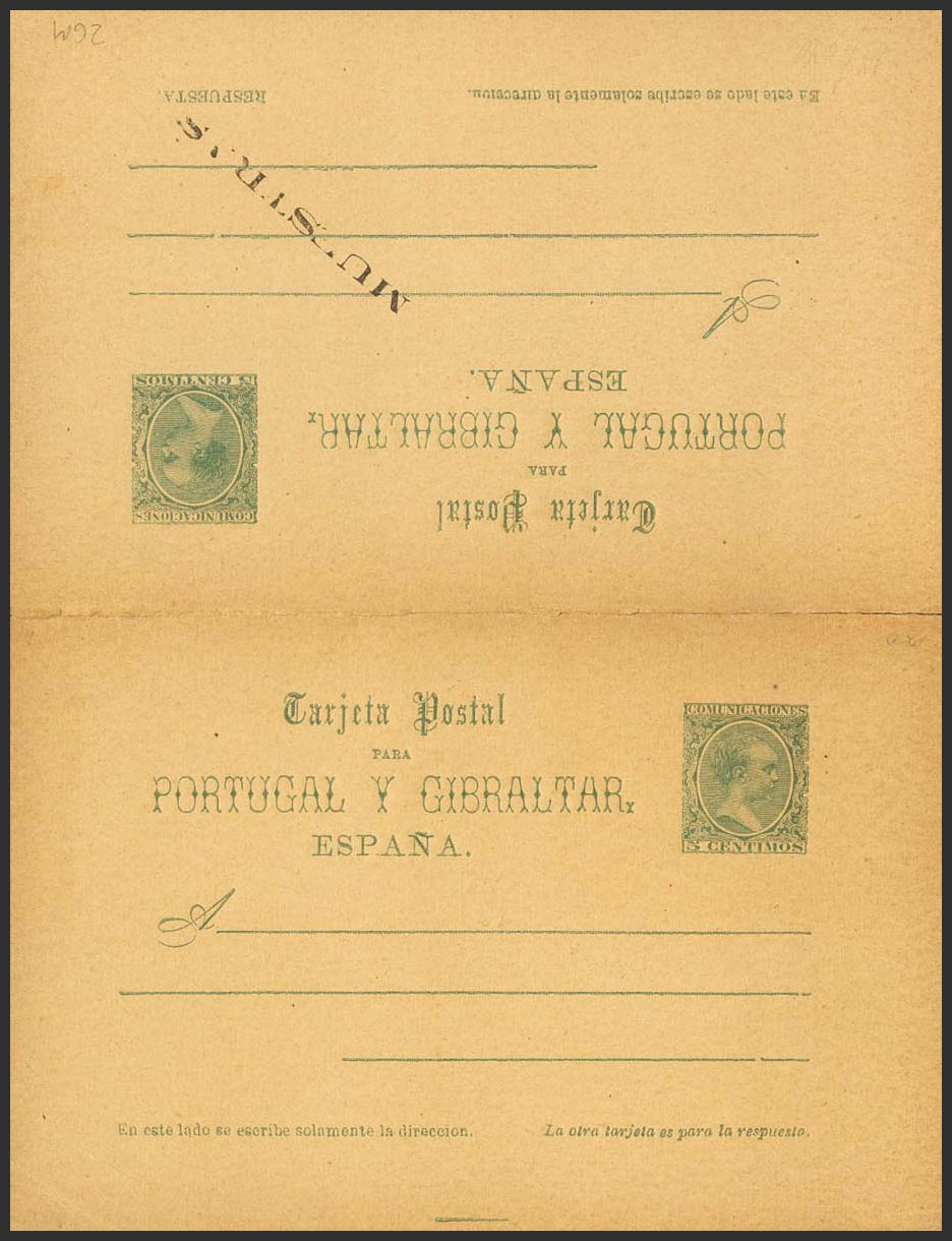 (★) EP25M, EP26M. 1890. 5 cts verde sobre Tarjeta Entero Postal y 5 cts+5 cts verde sobre Tarjeta Entero Postal, de ida y vuelta. MUESTRA. MAGNIFICAS Y RARA. Edifil 2017: 250 Euros