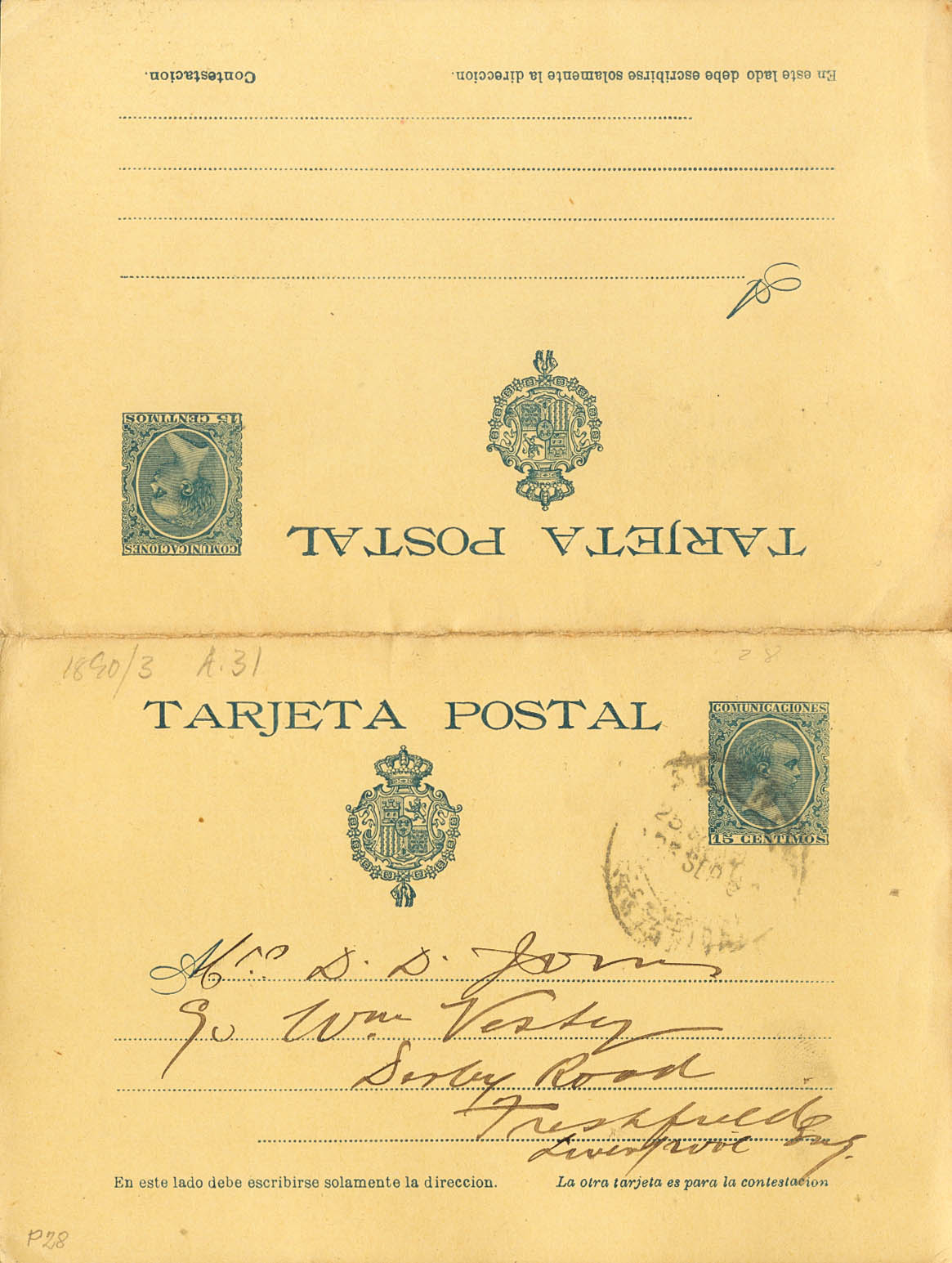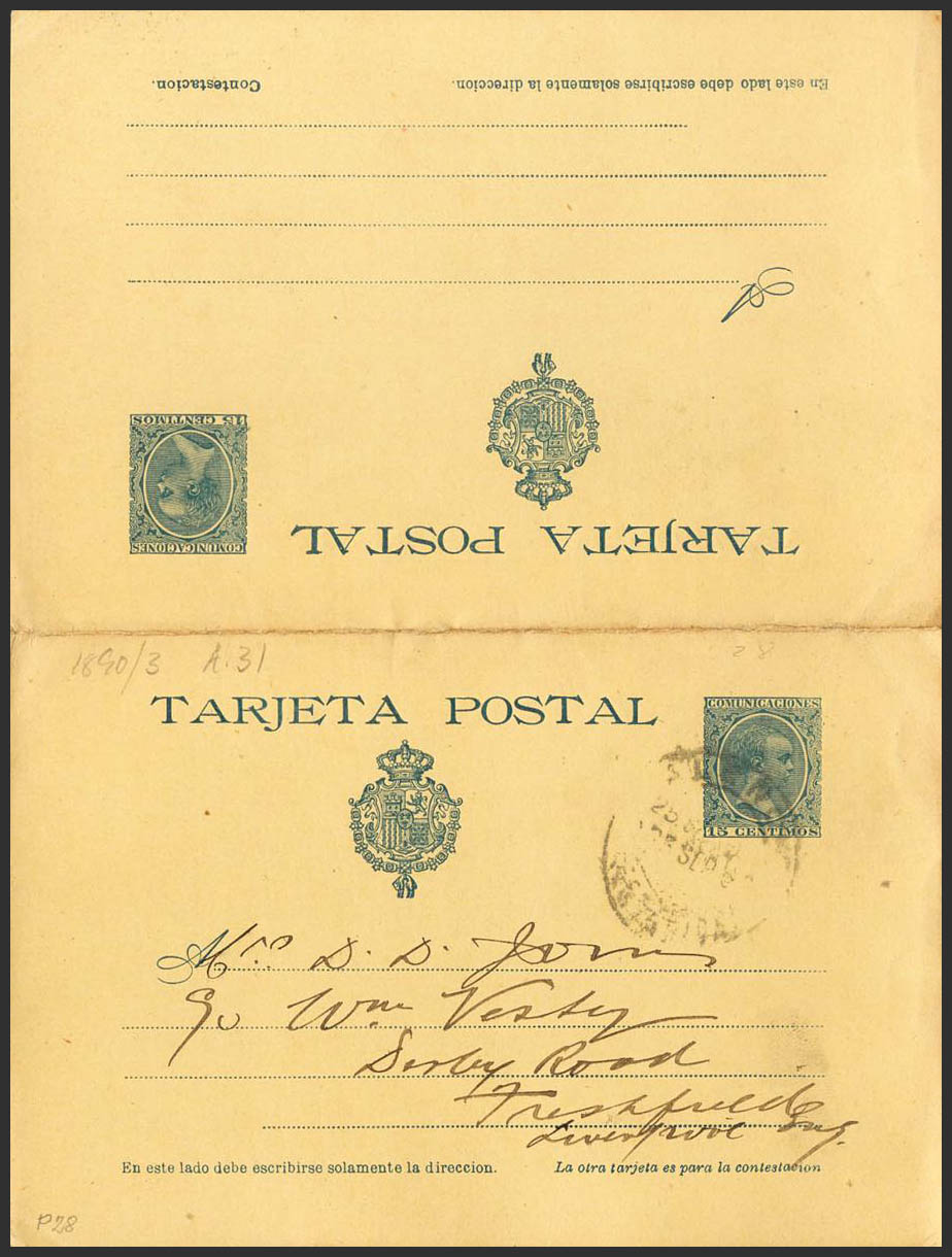 EP28. 1900. 15 cts+15 cts azul sobre Tarjeta Entero Postal circulada sólamente la ida de VALENCIA a LIVERPOOL (INGLATERRA). MAGNIFICA.