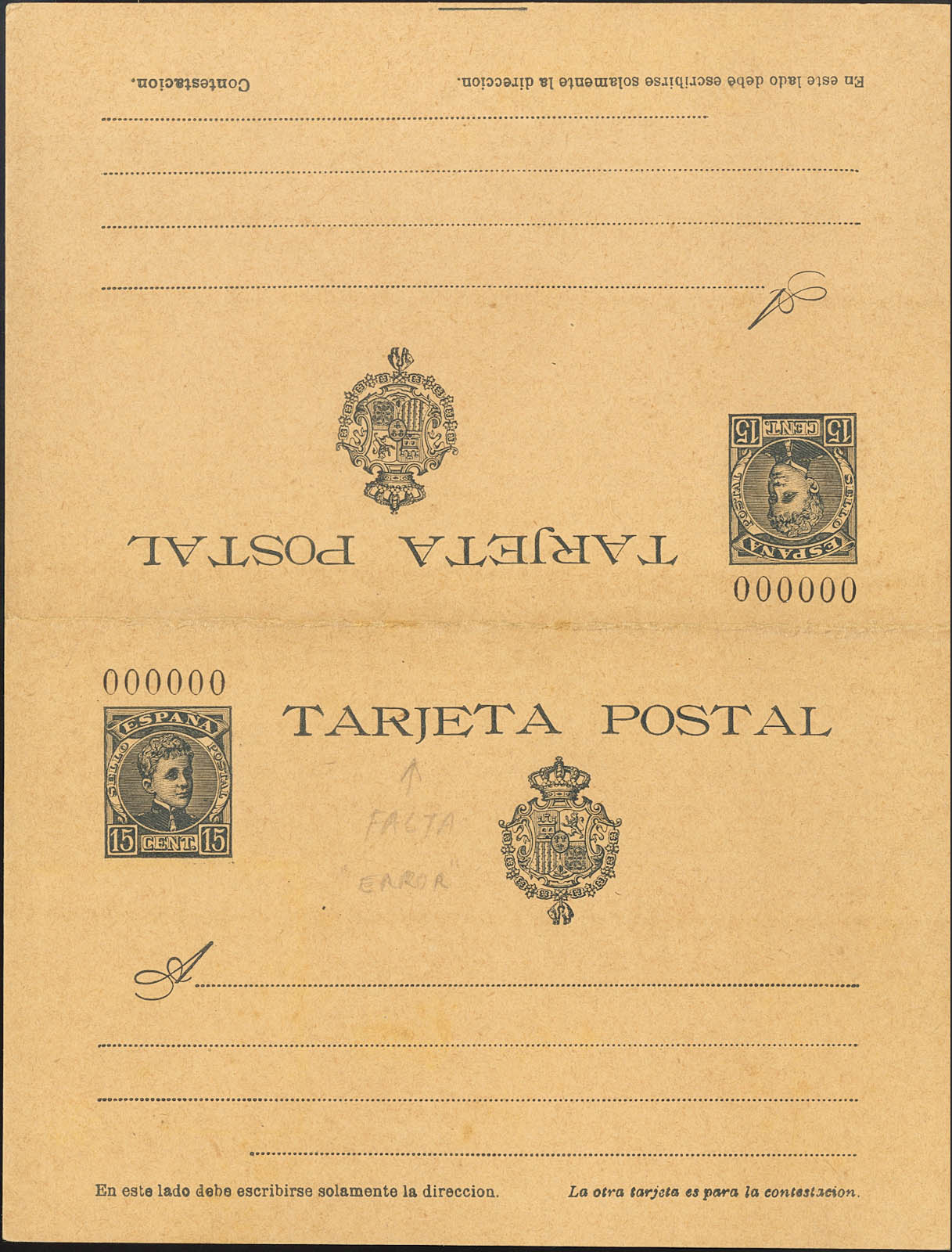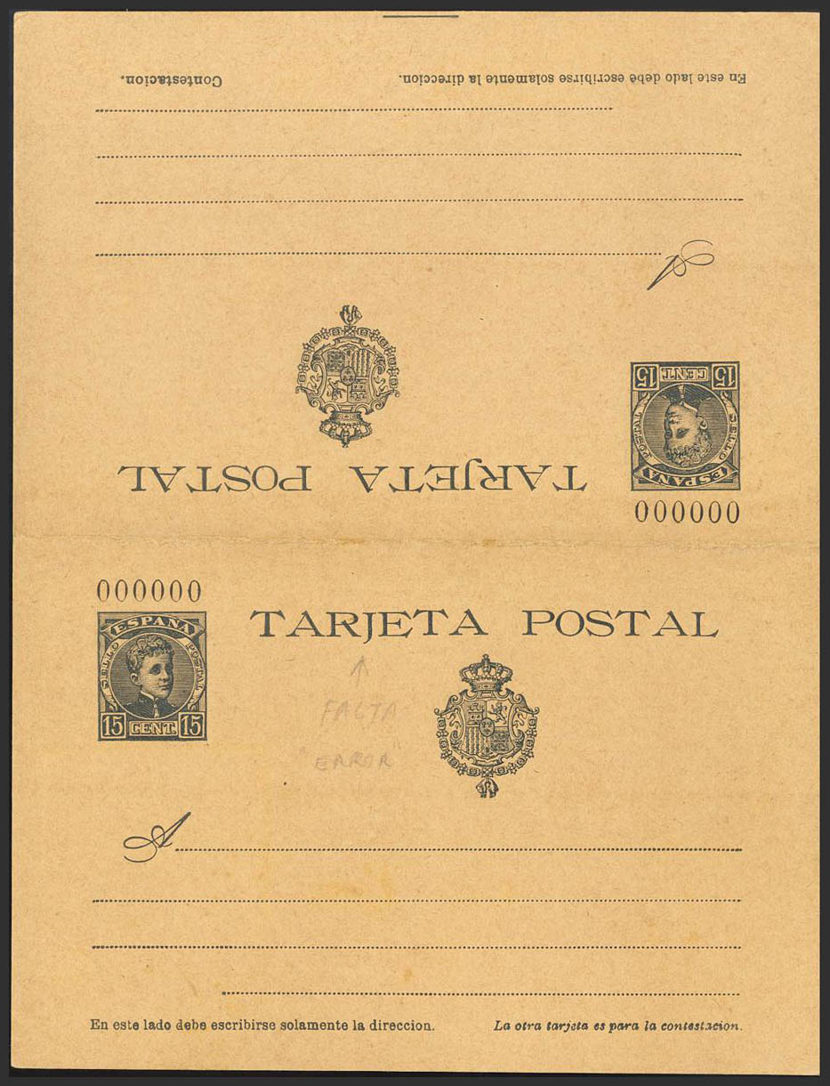 (★) EP38N. 1901. 15 cts+15 cts verde sobre Tarjeta Entero Postal, de ida y vuelta Nº000000. MAGNIFICAS Y RARAS. Edifil 2017: 105 Euros