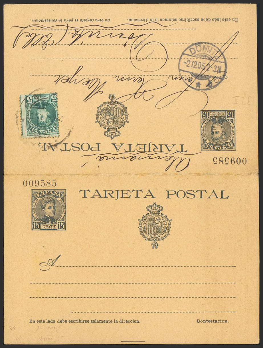 EP38. 1905. 15 cts+15 cts pizarra sobre Tarjeta Entero Postal de ida y vuelta, la ida circulada a DONITZ (ALEMANIA), con franqueo complementario de 5 cts verde. En el frente llegada. MAGNIFICA.