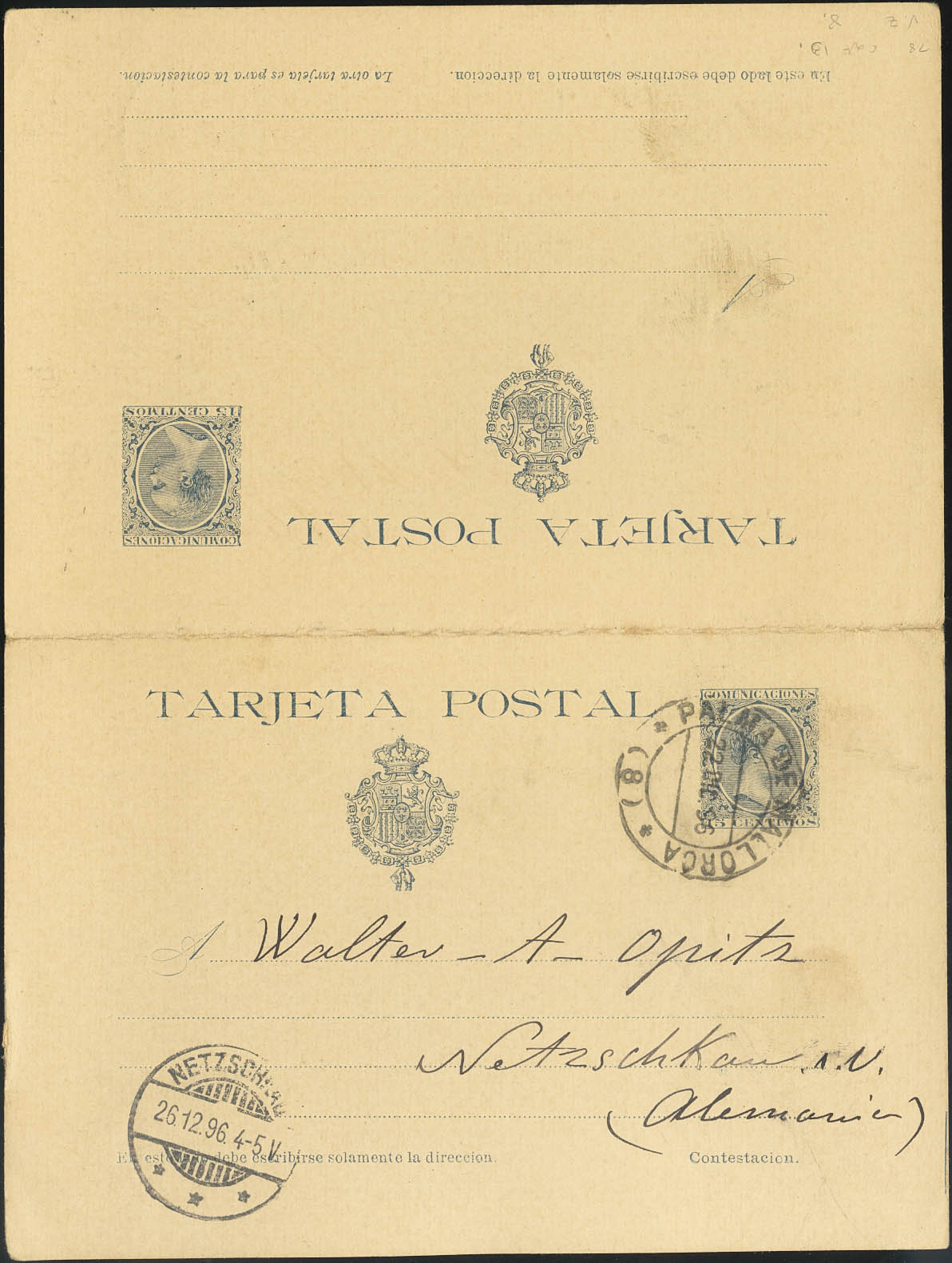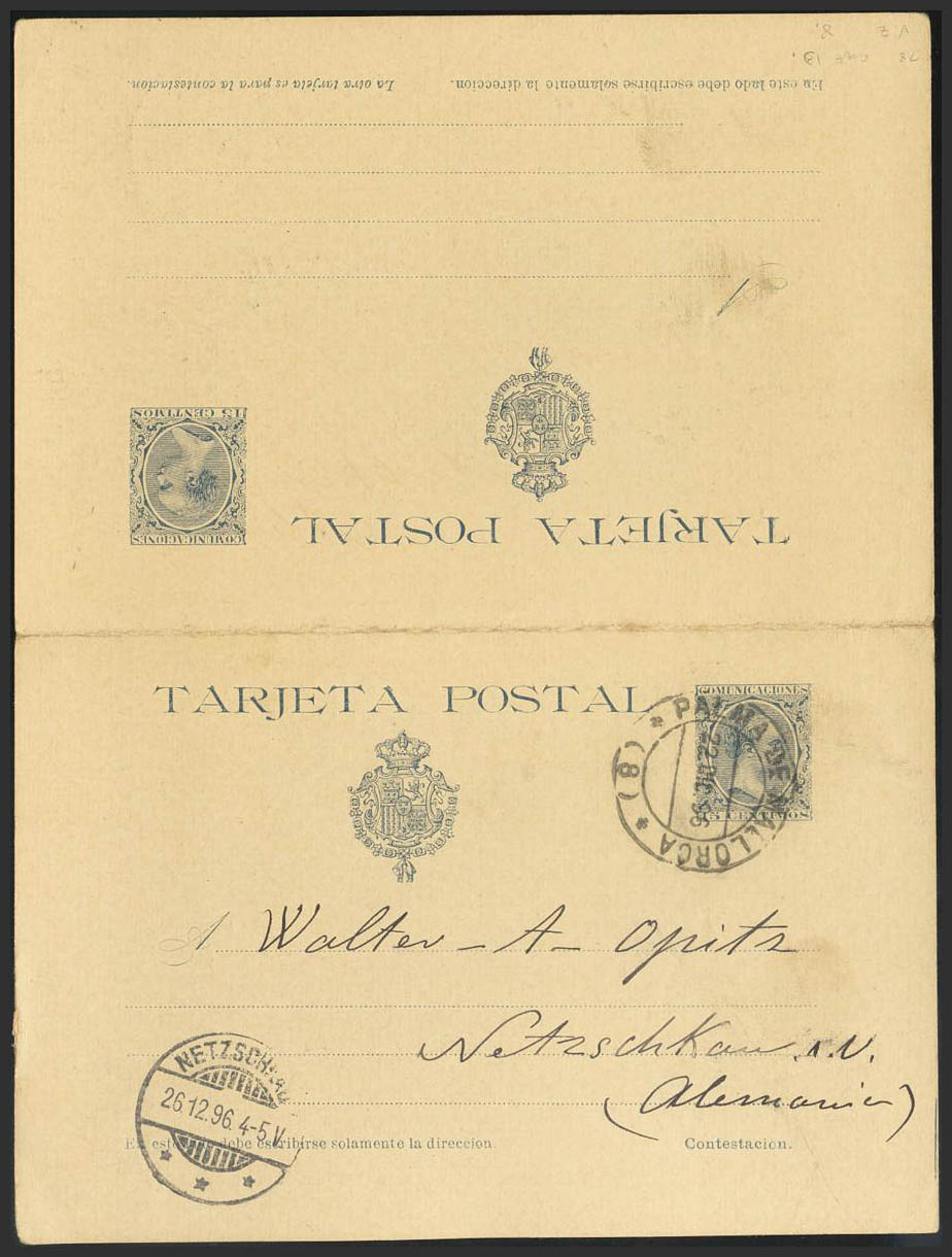 EP28. 1896. 15 cts+15 cts azul gris sobre Tarjeta Entero Postal de ida y vuelta, la vuelta circulada de PALMA DE MALLORCA a NETZSCHKAU (ALEMANIA). En el frente llegada. MAGNIFICA Y RARA.