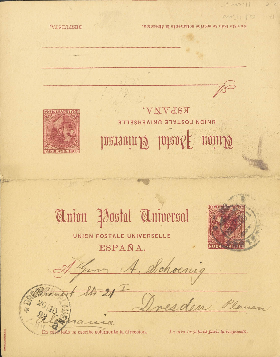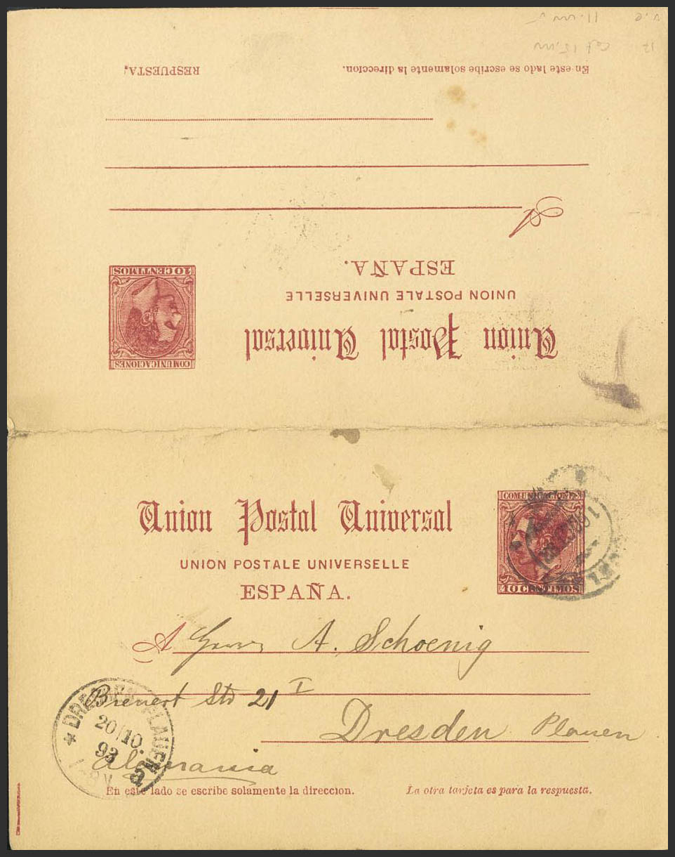 EP17. 1884. 10 cts+10 cts carmÃn sobre Tarjeta Entero Postal de ida y vuelta, la ida circulada de BARCELONA a DRESDE (ALEMANIA). En el frente llegada. MAGNIFICA.