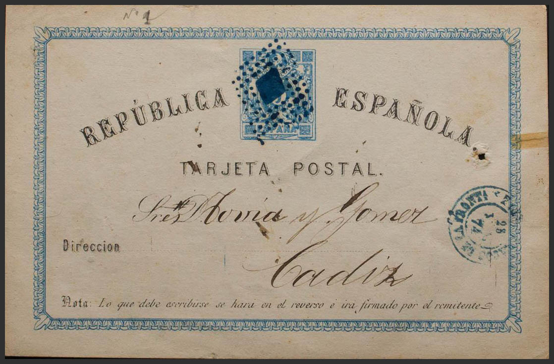 EP1. 1874. 5 cts azul sobre Tarjeta Entero Postal de ARCOS DE LA FRONTERA a CADIZ. Matasellos ROMBO DE PUNTOS, en azul. MAGNIFICA Y ESPECTACULAR.