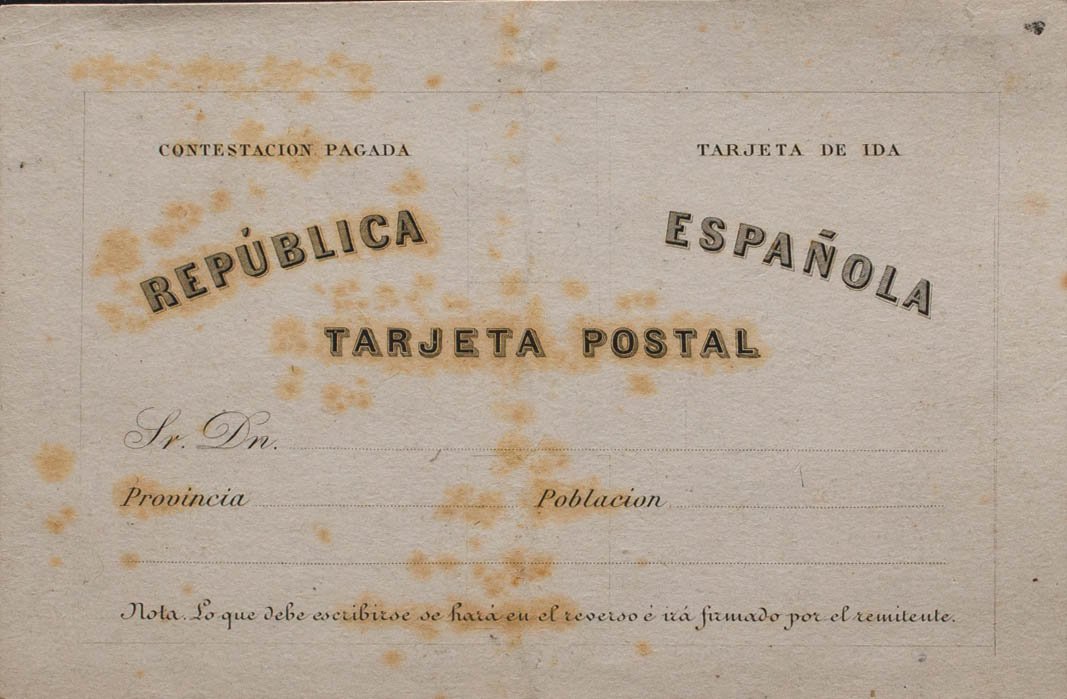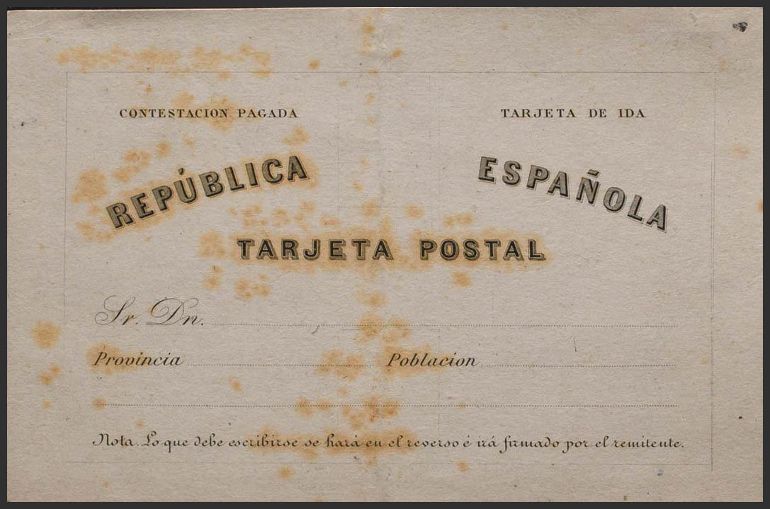 (★) EP6Pb. 1874. PRUEBA CALCOGRAFICA de la Tarjeta Entero Postal (de vuelta) del año 1873 (manchitas del tiempo). BONITA Y RARA. (Láiz 2006, 350 Euros)