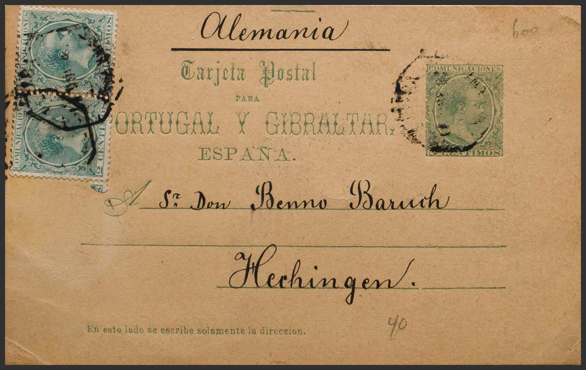 EP25. 1890. 5 cts verde sobre Tarjeta Entero Postal de MADRID a HECHINGEN (ALEMANIA), con franqueo complementario de 2 cts verde, dos sellos (podría faltar un sello). MAGNIFICA Y RARA.