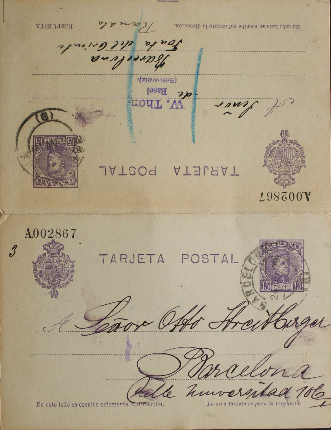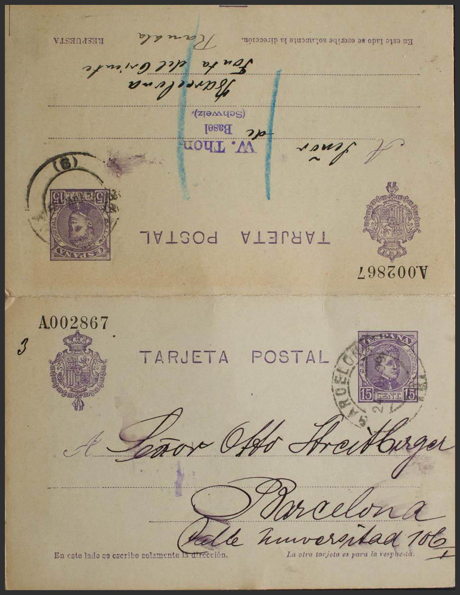 EP46. 1909. 15 cts + 15 cts violeta sobre Tarjeta Entero Postal la ida Correo Interior de BARCELONA y la vuelta de BASILEA (SUIZA) a BARCELONA (depositada en el correo de la ciudad). MAGNIFICA Y RARA. Edifil 2018: 190 Euros
